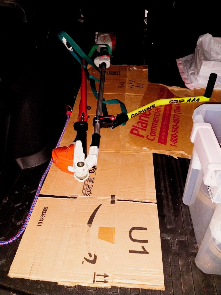 Above: The trimmer in transport mode (55” length). Blade protector is in place, tool is secured to the car in 2 places with straps & battery is removed for safety. Cardboard is in case the trimmer contacted poison ivy, wild parsnip or knapweed. The Darwin’s Grip can be folded closer to the trimmer shaft, but I decided not to test the quality of the quick release lever.