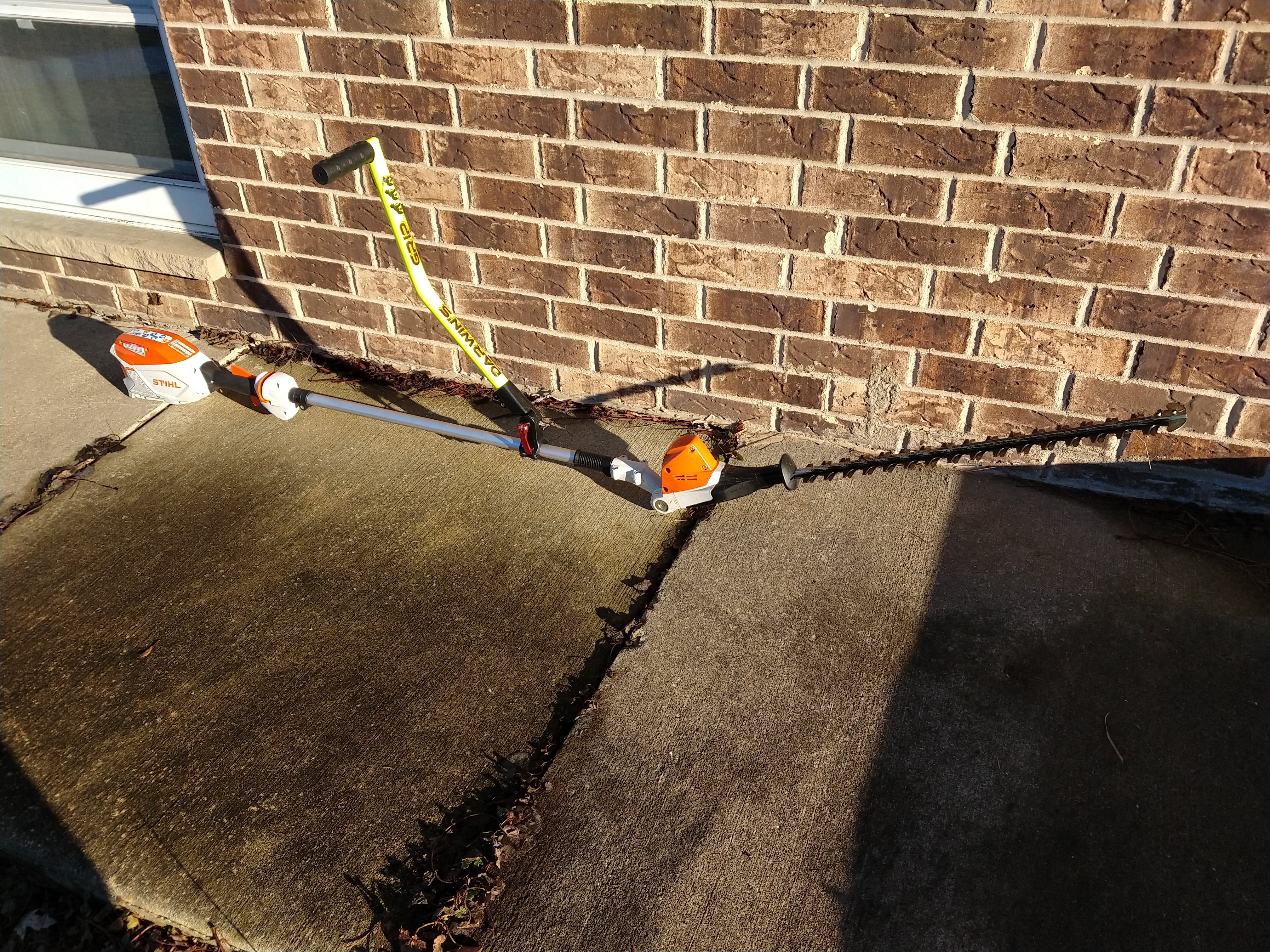 The discussion forum at http://www.lawnsite.com was particularly helpful in selecting a brand/model along with usage & maintenance tips. Battery technology has improved to the point that I didn’t have to buy a gas powered model. I don’t have a pickup truck or outdoor shed, so storing & transporting gas is a safety issue, plus gas tools are noisy & smelly. Several brands would be good choices, but I selected Stihl because there were plenty of professional users on the forum & a nearby power center sells & services them. I chose the HLA-66 because compared to other models, it weighed less, was less expensive & fit my use case of semi-professional reliability. Multiple people on the forum commented that this model held up well during commercial use, but probably wouldn’t take abuse as well as the more expensive models. It has two 20” long double sided blades, so it cuts on both the backward & forward strokes. The blades can fold up against the shaft for transport. For a mix of light density vegetation/high on-time & high density/low on-time I get 3.5 hours use on an AP300S battery. So with 2 batteries I can cut all day.