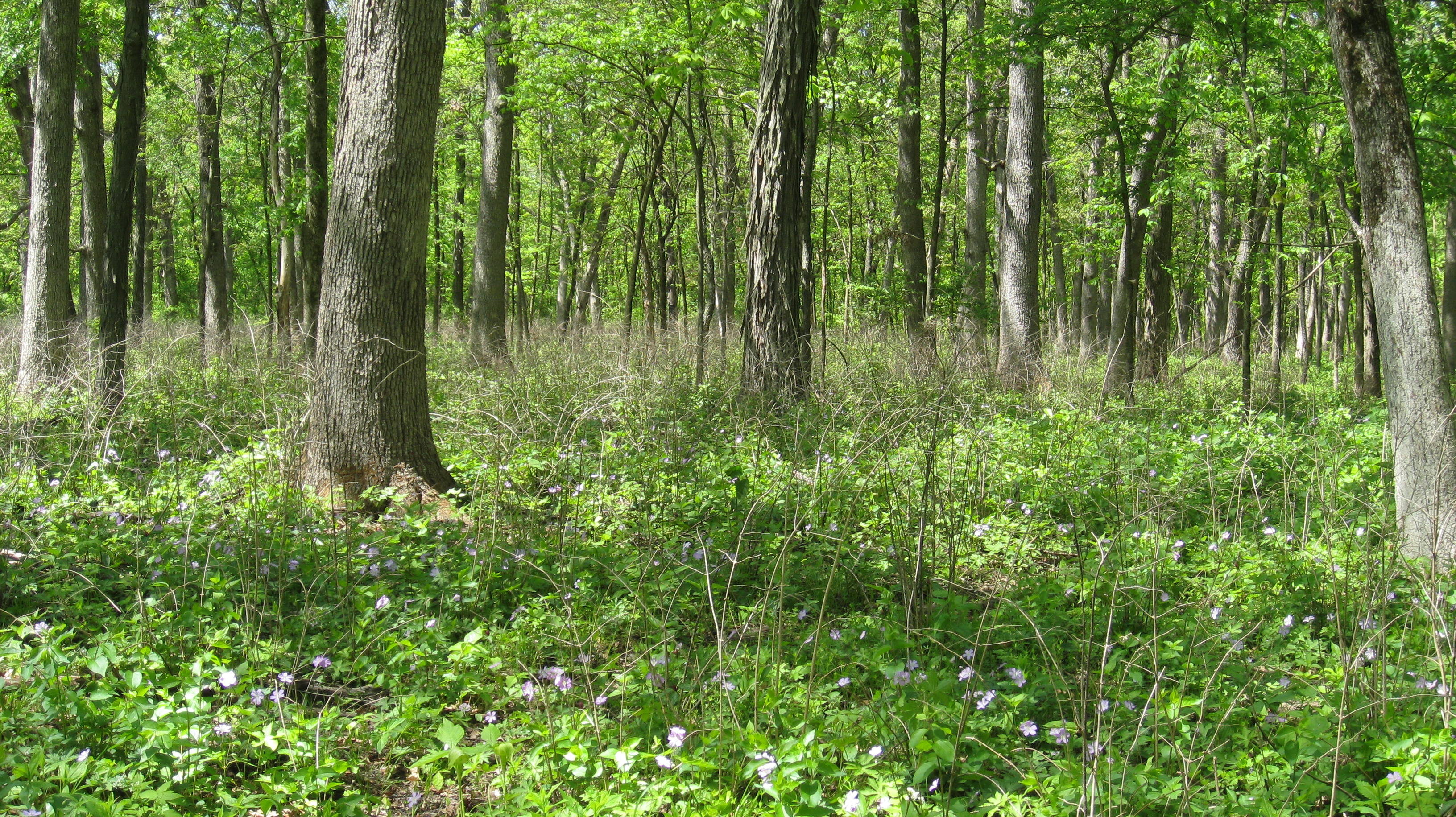 Photo below is from the same area but a few weeks later, May 3, 2010.  The lovely wild geraniums are in bloom!  Look at the all the honeysuckle stems with no leaves on them.  The fire top killed them.  Does fire control honeysuckle?  Sort of.