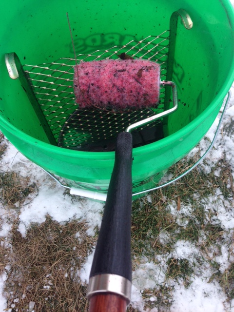 Below are some of our paint roller applicators sticking out of the buckets. In the bucket is an inch of basal bark mineral oil herbicide mix. You have a 5 inch long paint roller on a handle cut to about 30 Inches. There is a screen to roll back and forth on to get rid of the excess solution. Make sure roller has stopped dripping! Then take roller to your honeysuckle and roll the solution on the stems. This works.