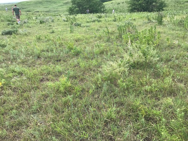Konza is divided into various watersheds for decades long ecological studies. Here is a photo of a watershed that is Fall burned Annually, with no grazing. It has a lot of grass and forbs.