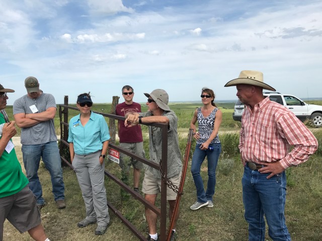 The GRN format has us in the field to see and discuss. Here are some Konza stars: In the aqua blue shirt is Jill Haukos who runs many education programs at Konza, then clockwise is Walter Dodds who showed us his study of the effects on stream water chemistry after thinning brush from an encroached stream. John Briggs runs Konza. Sara Baer, as I noted above, was the lead planner and host of this GRN. Last with the Western hat is KC Olson who works for KSU on the livestock grazing end of research.