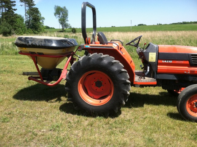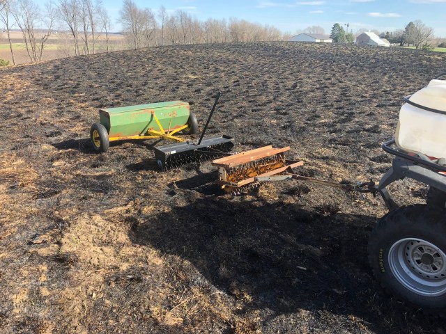 We also have a Vicon pendulum seeder that we use for areas up to a few acres. These are good for areas with stumps, brush and other obstacles. We extended the mixer rod inside the hopper to keep the seed from bridging.