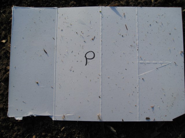 Below is a photo of a test where I sprayed glue on paper and ran the drop seeder over it one time to see how it spread the seed. I liked the results.