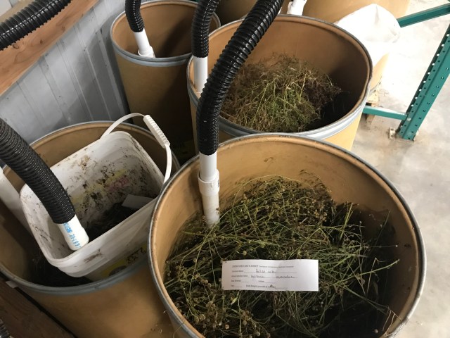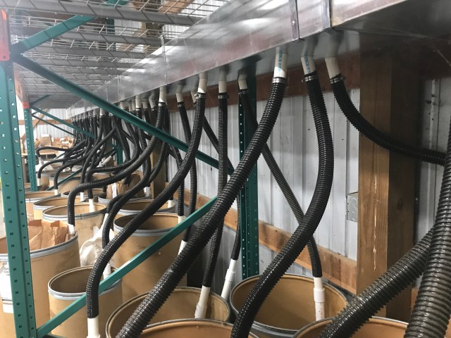 At Nachusa we hand harvest with scissors and buckets several thousand pounds of seed from a few hundred species of plants. When we bring in our seed it typically needs some time to dry so it does not mold. We have found that blowing in a small amount of air into a barrel of damp seed will dry it out quickly. We have 51 drier tubes to dry 51 barrels of seed at one time!