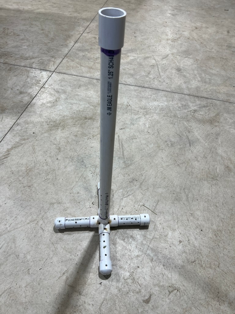 The reason for the flared PVC piece previously seen is that is slides into this drier stick fitting. This allow the black drier tube to quickly attach to the barrel of seed to be dried. The drier stick is what goes in the empty barrel that you will dump your damp seed into. This is standard 1.25″ PVC. I purchased the 5 way fitting at bottom online. Glue the pieces together and drill a lot of holes in them to move the air.