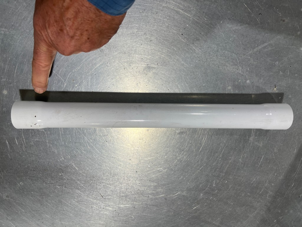 This “PVC 1.5″ extension tube solvent” proved handy. My HVAC contractor bought us a box of them. Note that they flare out a touch on both ends. We cut the tube in the middle.