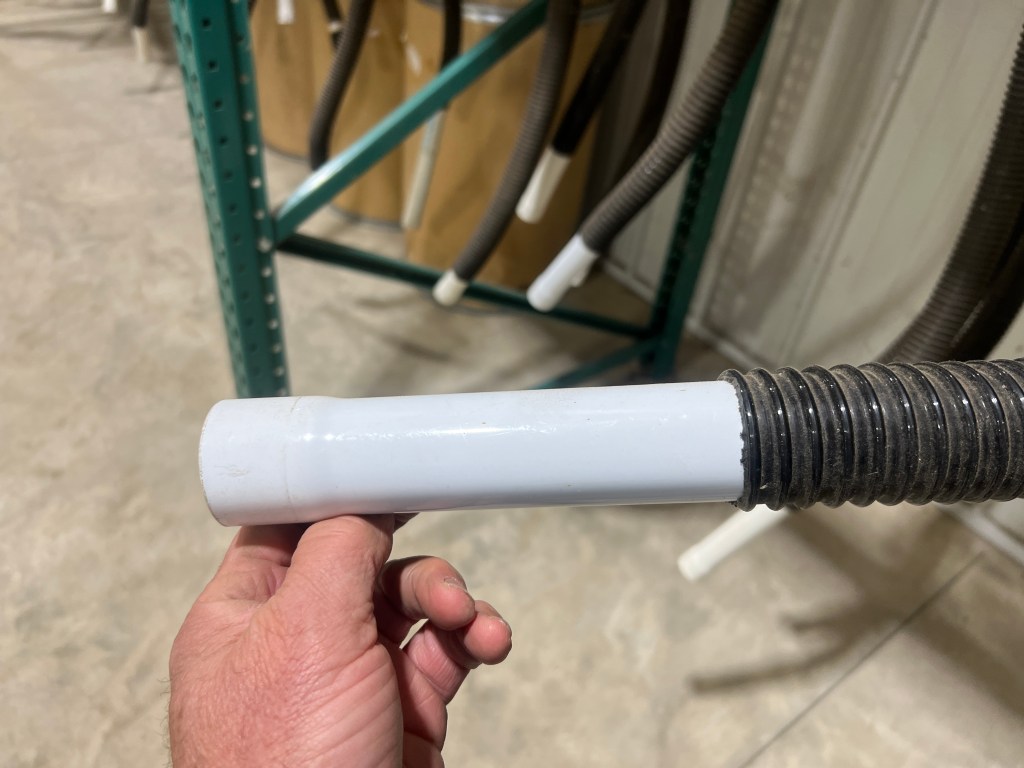 By coincidence, one half slides inside the black pipe snug enough to not require a clamp. The black tubed is suction hose used on central vacuum systems. You can buy 100 foot rolls of this online. The tube is smooth on the inside which means it won’t whistle as it would if the ridges were on the inside. We tried cheaper sump pump hose but it whistled crazy loud.