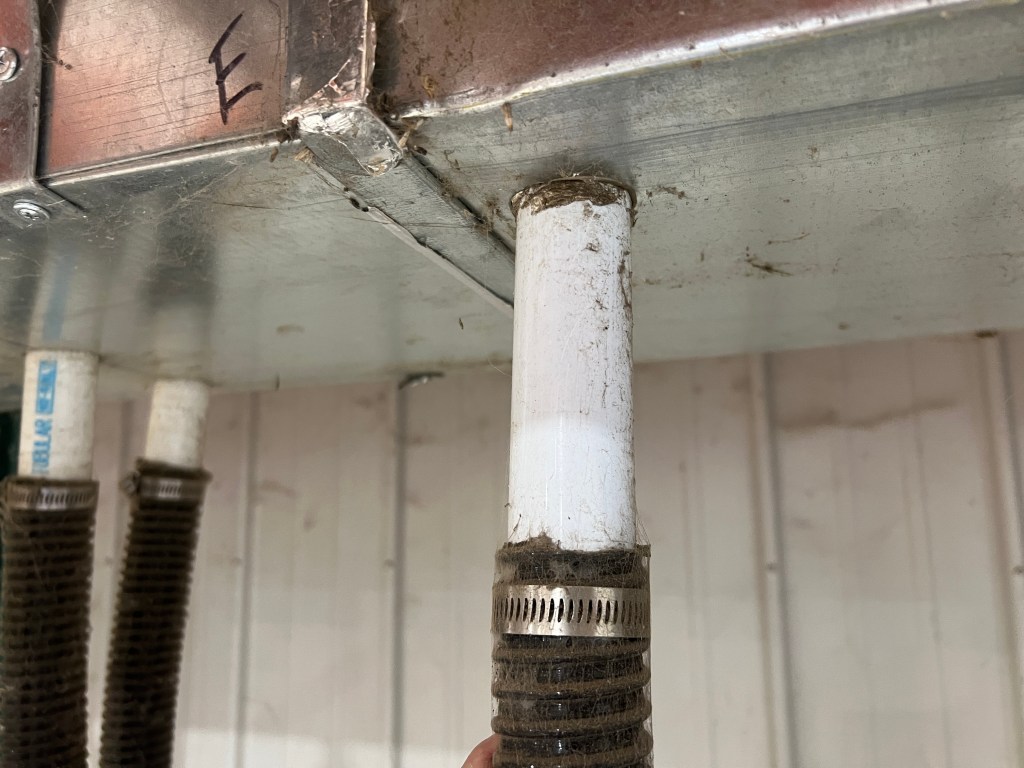 The other half of the white PVC slides into the top of the hose. Here we used a hose clamp. The flared end is inside the metal duct. The hole in the duct is drilled just the right size so the flared end supports the tube. Your contractor will have drill bits to make these holes fast. You want to dangle a lot of hose.