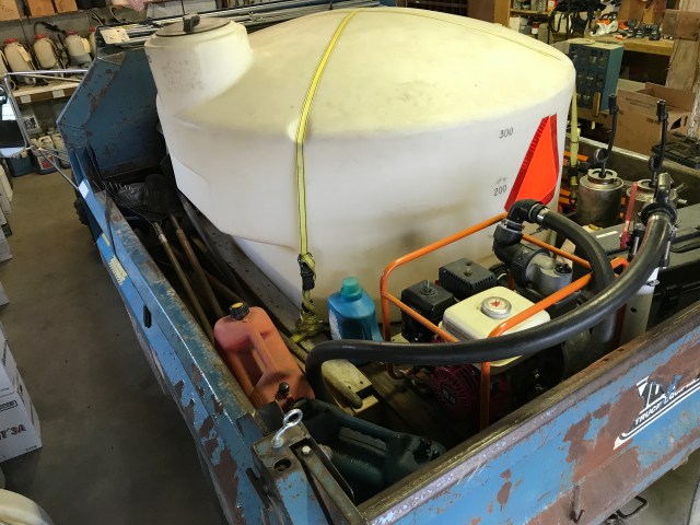 Below is one of our units. Note rake strapped at an angle such that it does not hit you in the head when you start the pump motor. Our name is on the rake so we get it back at the end of the day. The hose is yellow so you see it in the grass. The hose is a narrow diameter so it is light weight to maneuver easily. The drip torch holders are made from wood painted black. The laundry detergent bottle in the box is filled with Class A foam. “Add two caps of foam” says the print on the side of the tank fill. And it all fits in the bed with the tailgate up. The tank is 70 gallons which is about ten gallons too heavy.