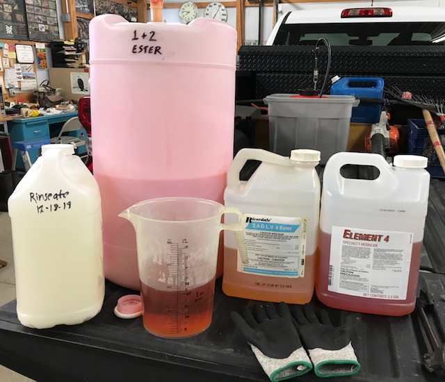 I prefer to fill up 15 gallon drums of this mix in my shop and then head out for the day. I rarely, if ever, carry concentrated jugs of herbicides in my truck. I don’t want to be responsible for cleaning up a chemical spill mess involving concentrated chemicals. Fortunately, it has never happened to me.