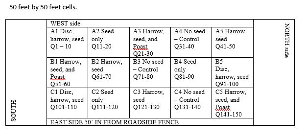 This was in an established prairie, with reasonable forb diversity, rather thick in warm season grasses. Look at the top row of cells. In cell A1 we worked up the prairie sod with a disc, then raked it with a harrow, and then seeded a rich and abundant mix of seed, well over 50 species at a heavy pounds per acre. Would this cell turn out the best?