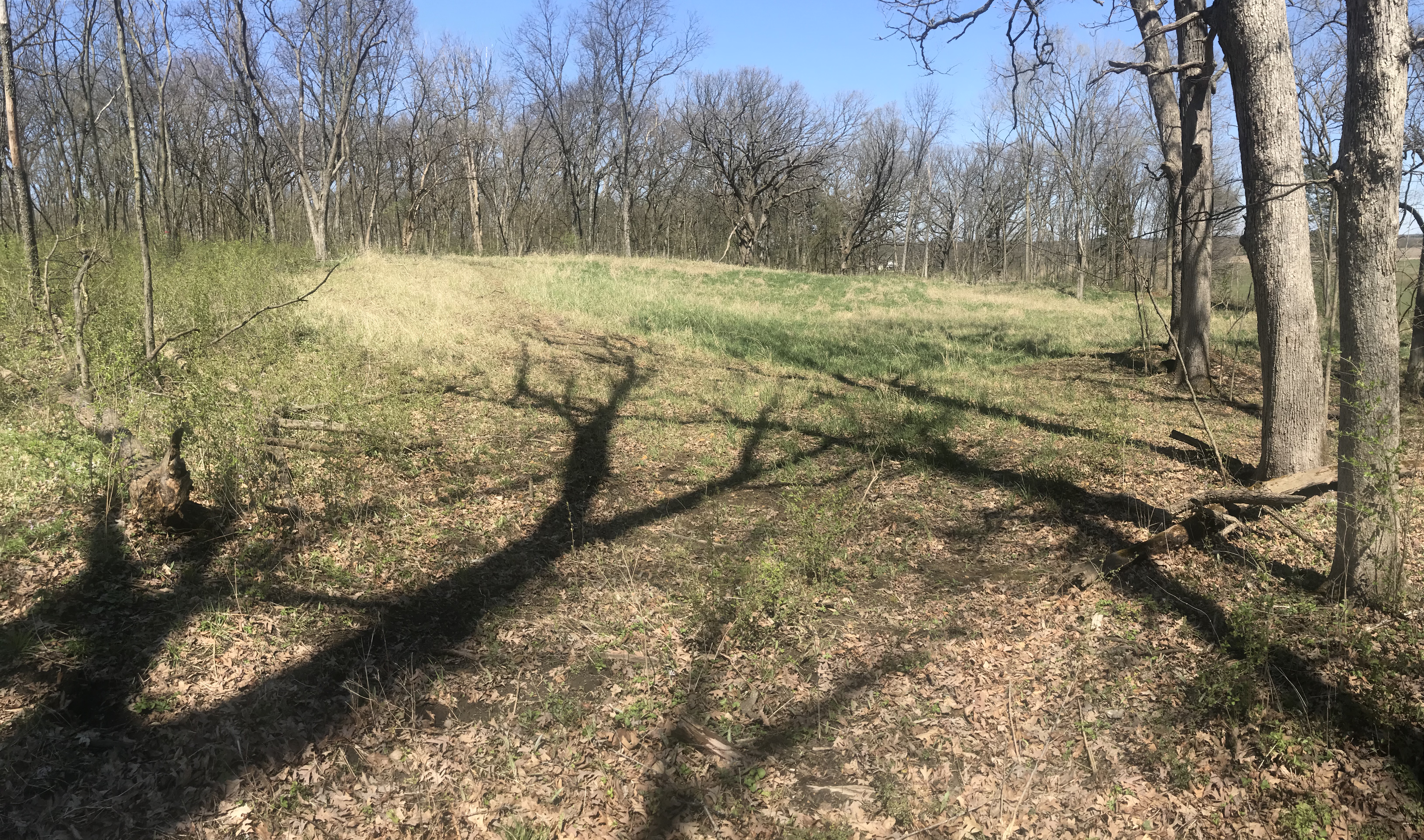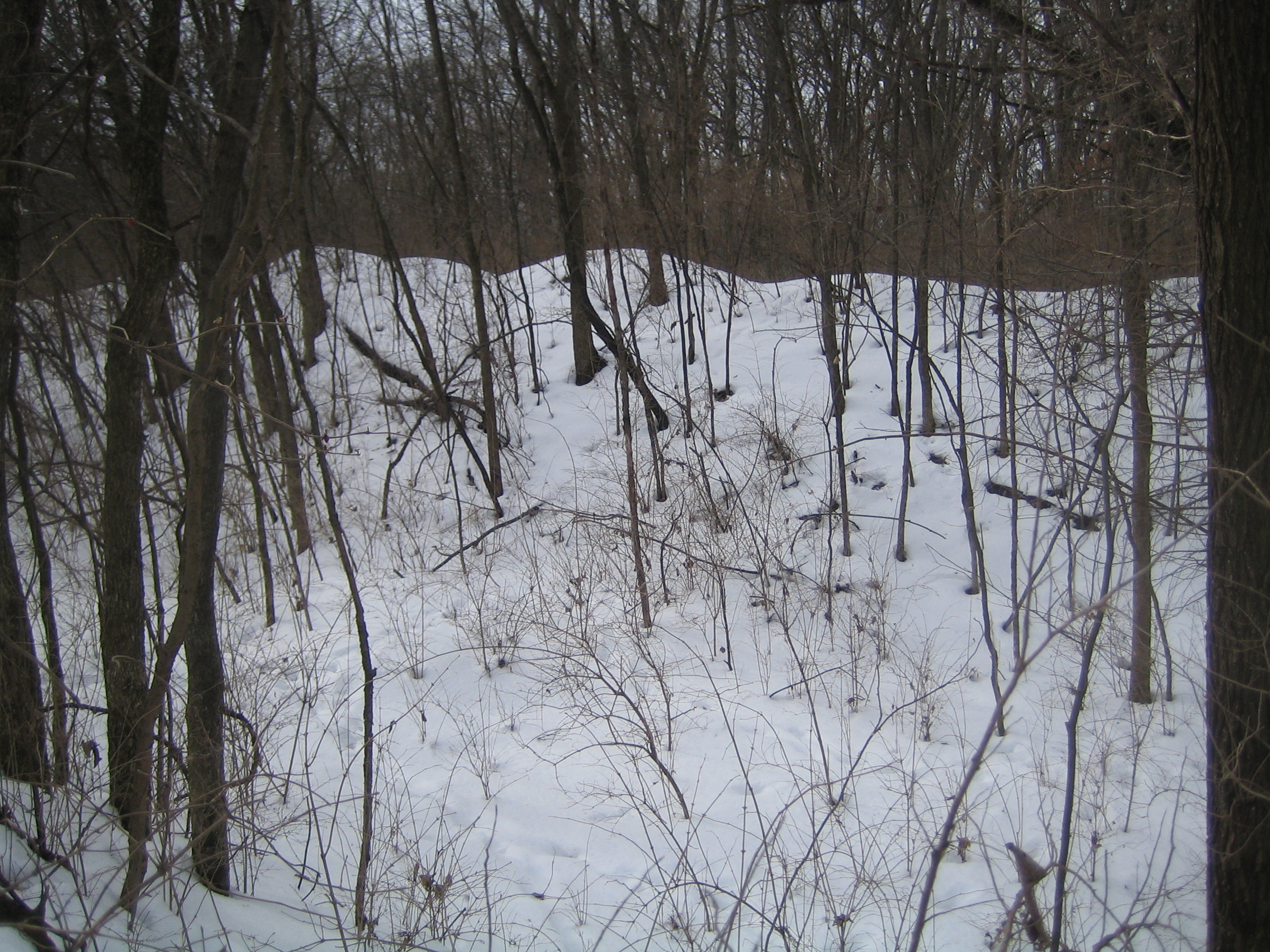 The photo below is the old gravel “borrow” pit.  The trees are mostly elm, some Osage orange, cherry.  The spoils are bigger and more abundant than my photo suggests.  The area surrounding the pit is a rather nice oak hickory woods.