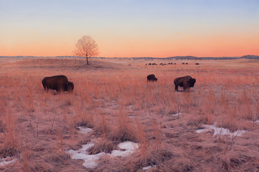 Late Afternoon on the Grand Prairie of Illinois c.1491 Bill: This is a big painting at a width of five feet. That current view would be perhaps a few acres of prairie surrounds by crops to the horizon. I try to imagine what it was like before modern settlement. In 1491, many Native American villages of various tribes would have been located along the rivers and in the oak groves. Such prairie landscapes that may appear daunting to us likely felt to them like a bonanza of tubers, berries, fruits, seeds, fibers and animals to harvest.