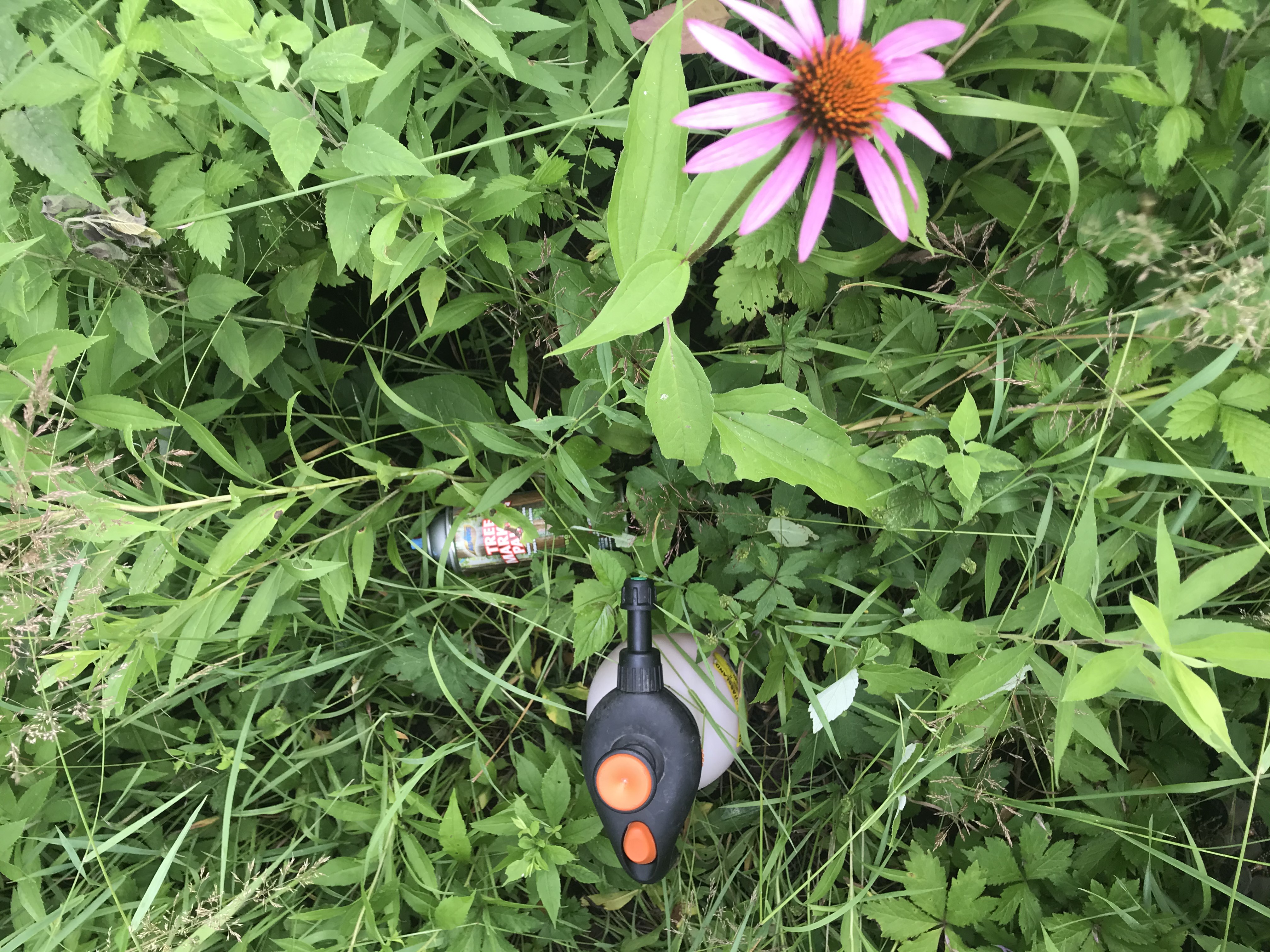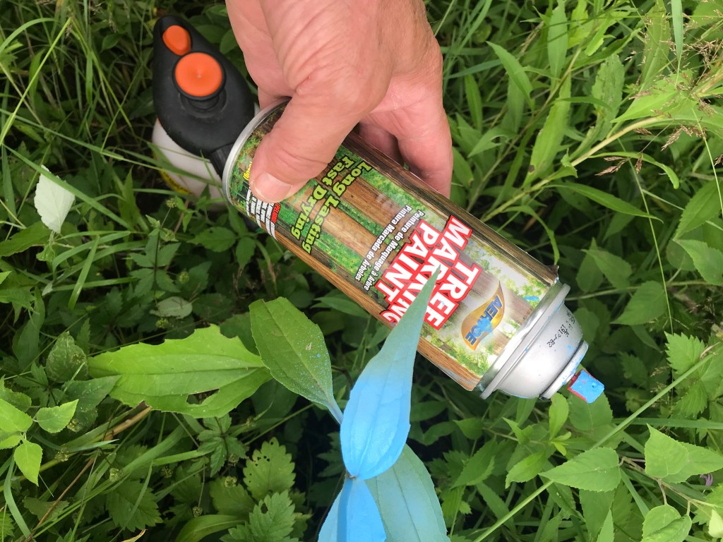 The E purpurea is above, with a can of blue tree marking paint, and a Stihl SG11 hand sprayer with a standard 20% solution of Garlon 4 in basal bark mineral oil carrier.