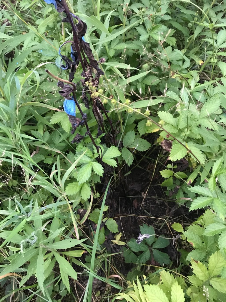 This photo is typical. Four weeks after treatment all plants appeared dead. Collateral damage is modest. You will recall from an earlier post that this method also worked well on birdsfoot trefoil, Lotus corniculatus. I could have chosen to foliar spray, or perhaps dig them up.