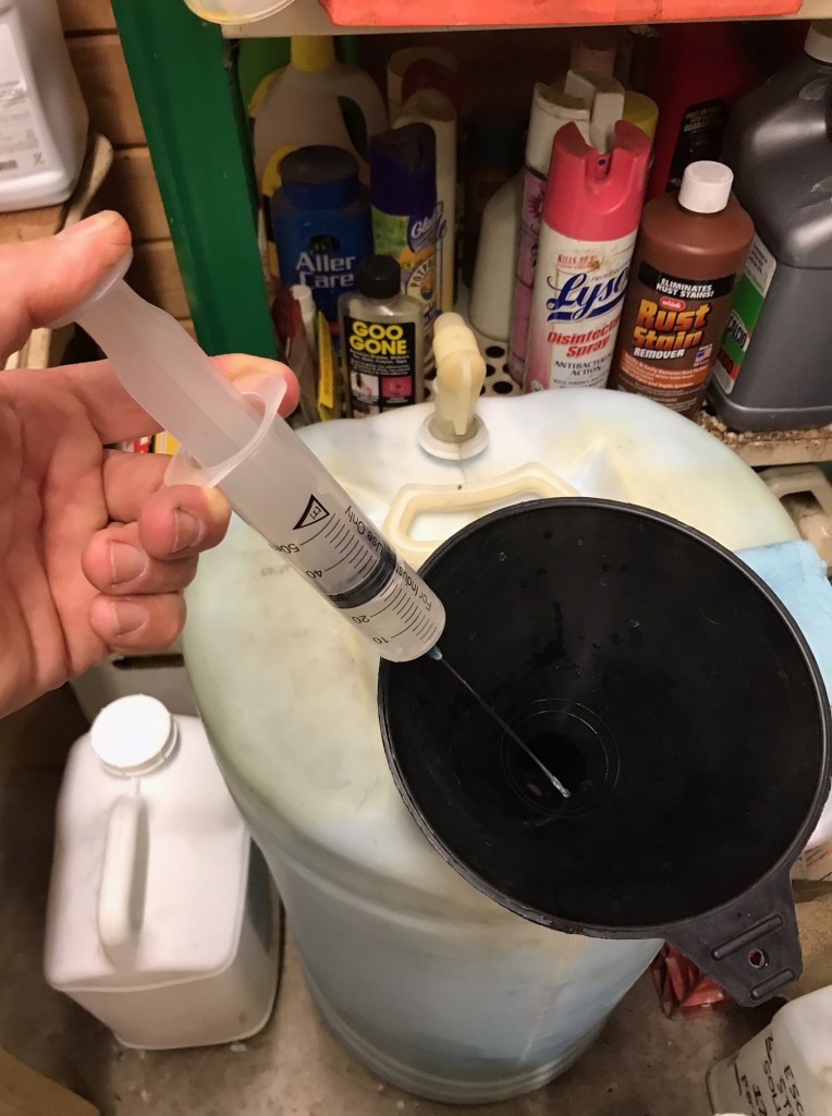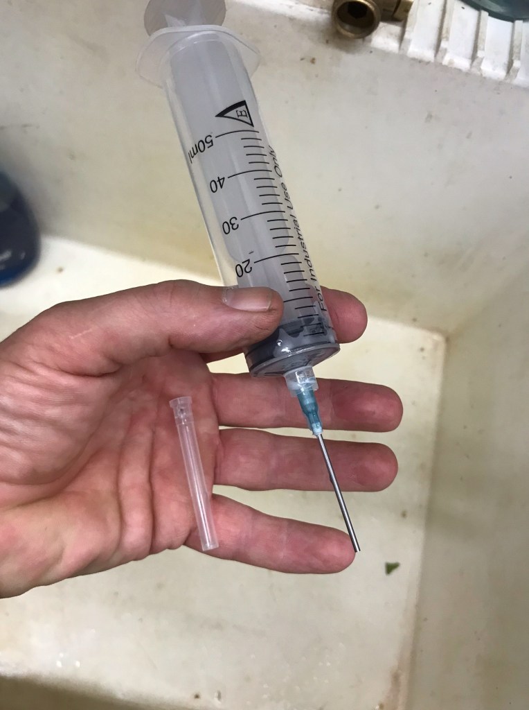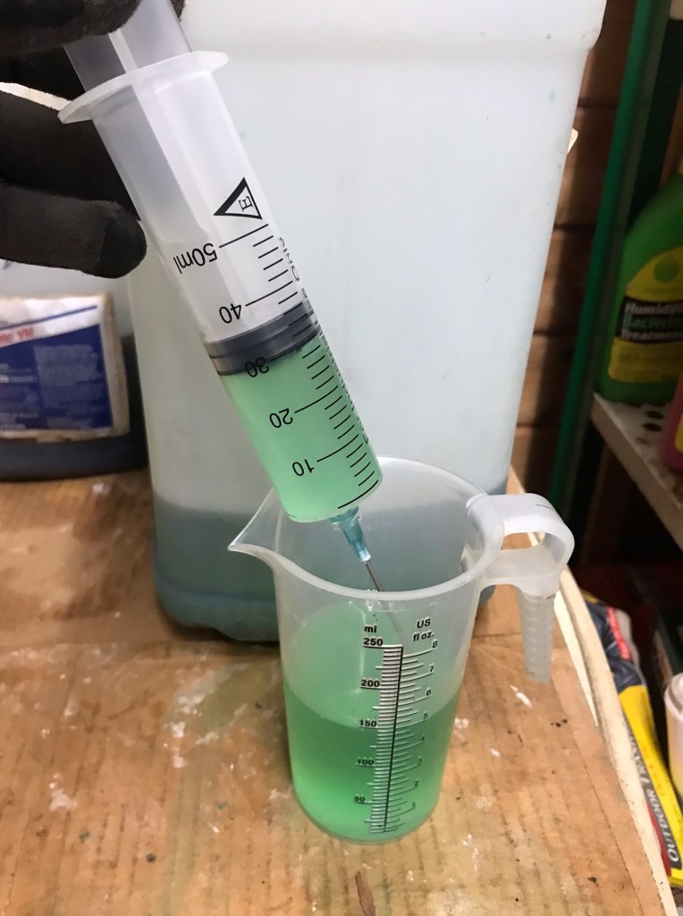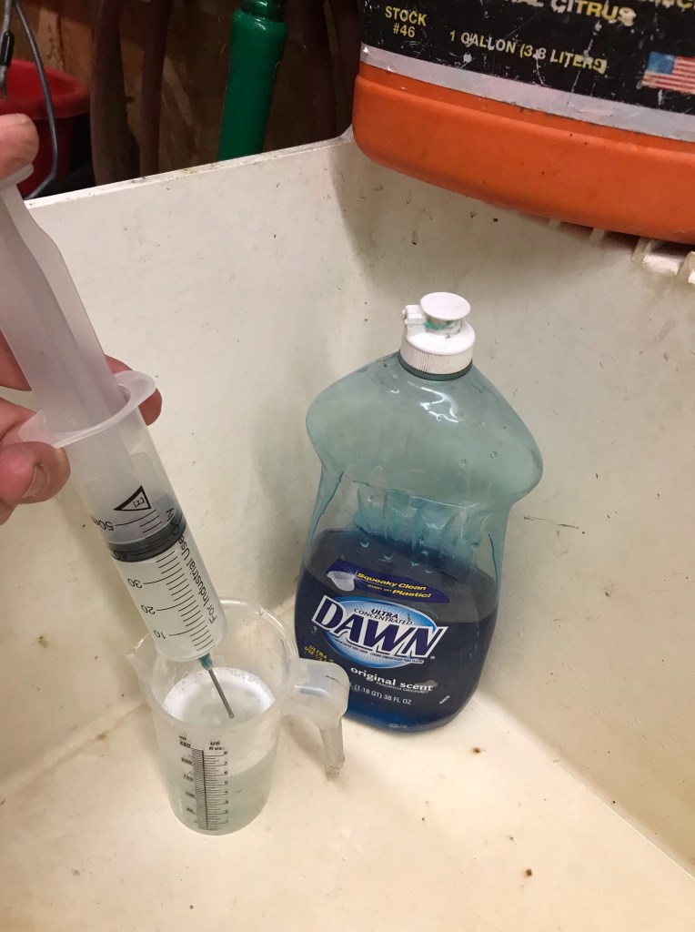 Heading back to the shop sink. Put a little soap in a cup and run the soapy water through the syringe a few times to clean it up good.