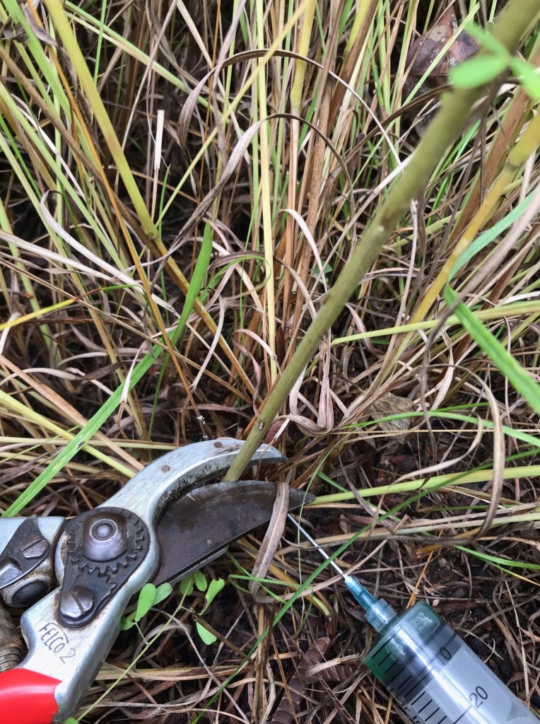 After placing the plastic cap on the syringe, grab your favorite sharp hand clippers. I like Felco #2’s. Find and cut the Lespedeza low to the ground.