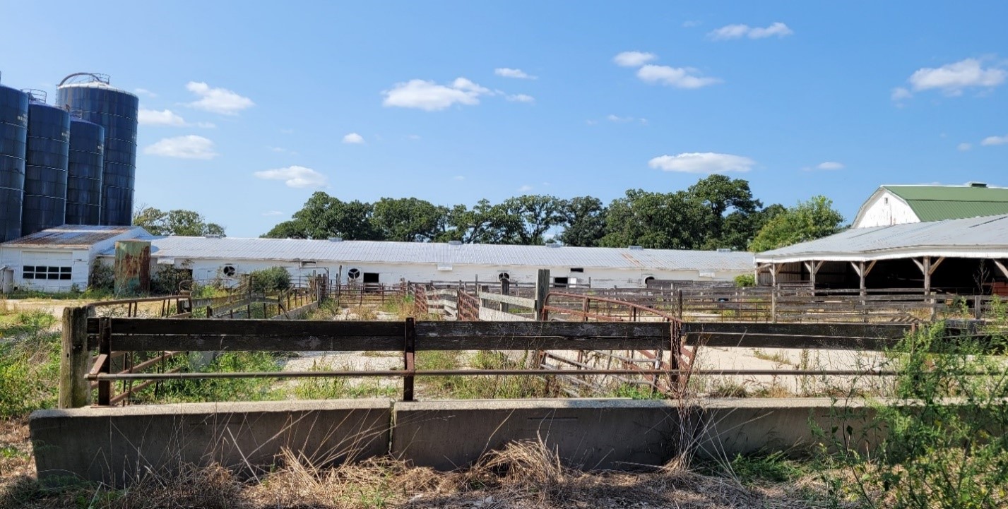 Former cattle operation corral and feedlot buildings.