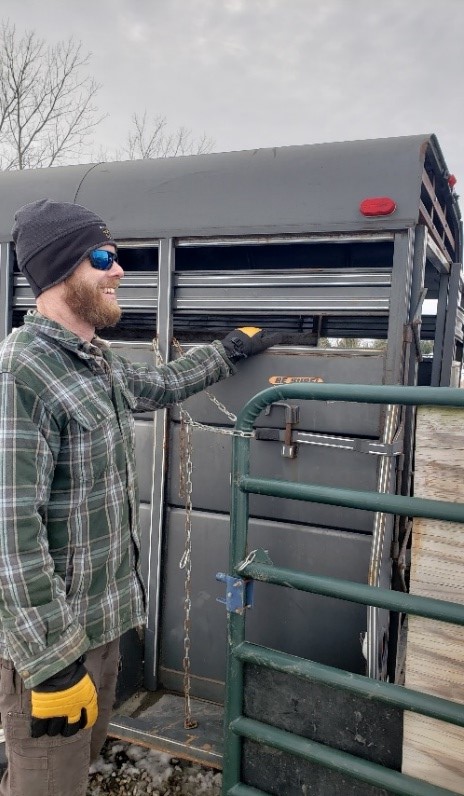 MCCD Restoration Ecologist Chris Zeiner manning the trailer awaiting a young bison bull to load.