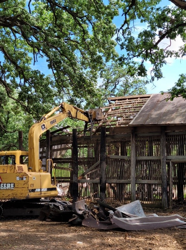 MCCD Restoration Ecologist John Peters using the big guns to take down an old corn crib.