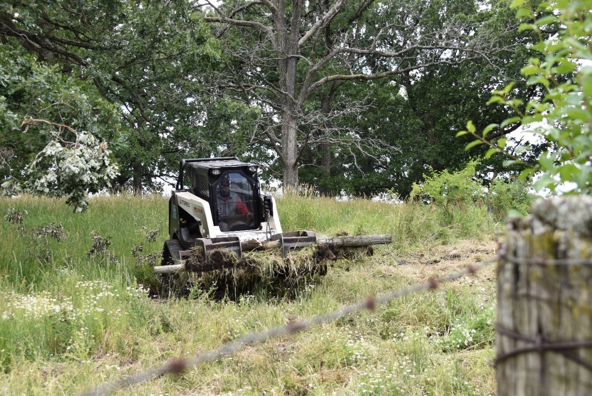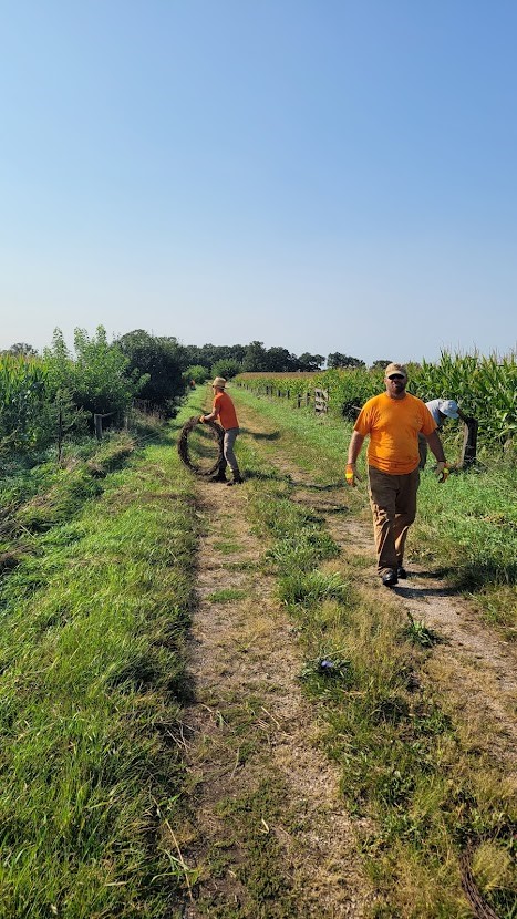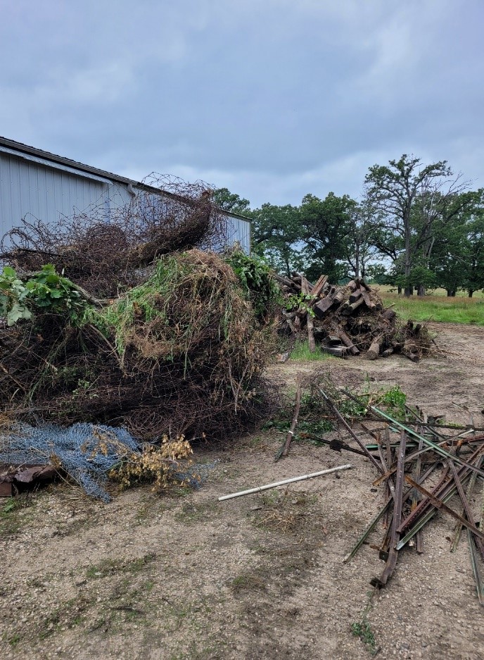 As part of the lease MCCD agreed to remove all remaining cattle fence as it was inadequate to hold bison. We also needed to get rid of an old corn crib, concrete slab, and many old tires and other garbage. This part of the project took a team effort including a great volunteer group who knocked out a large chunk of the fence in one day. The natural resources crew took care of the rest, and after four large metal dumpsters and three large garbage dumpsters were filled, the first phase of the cleanup was done.