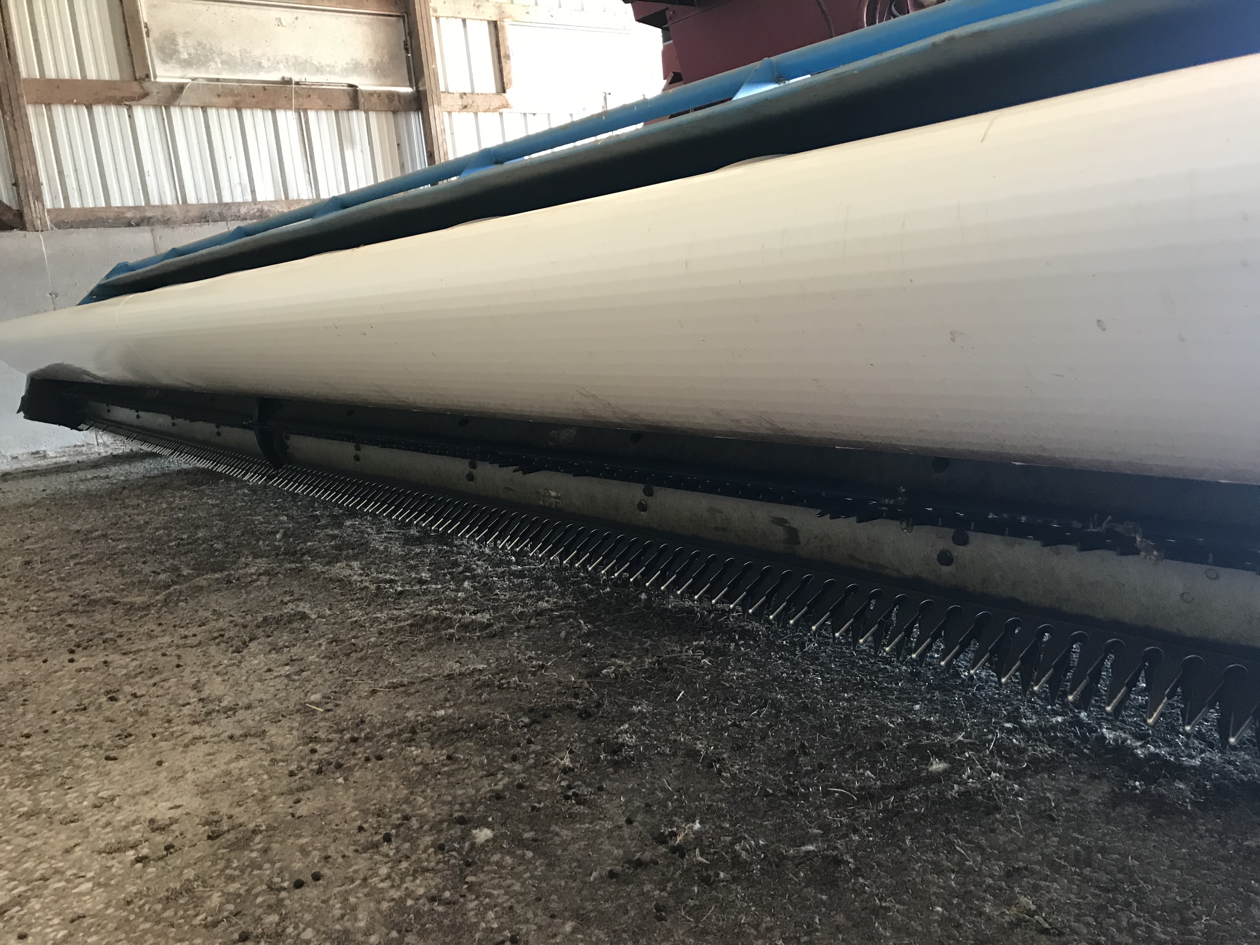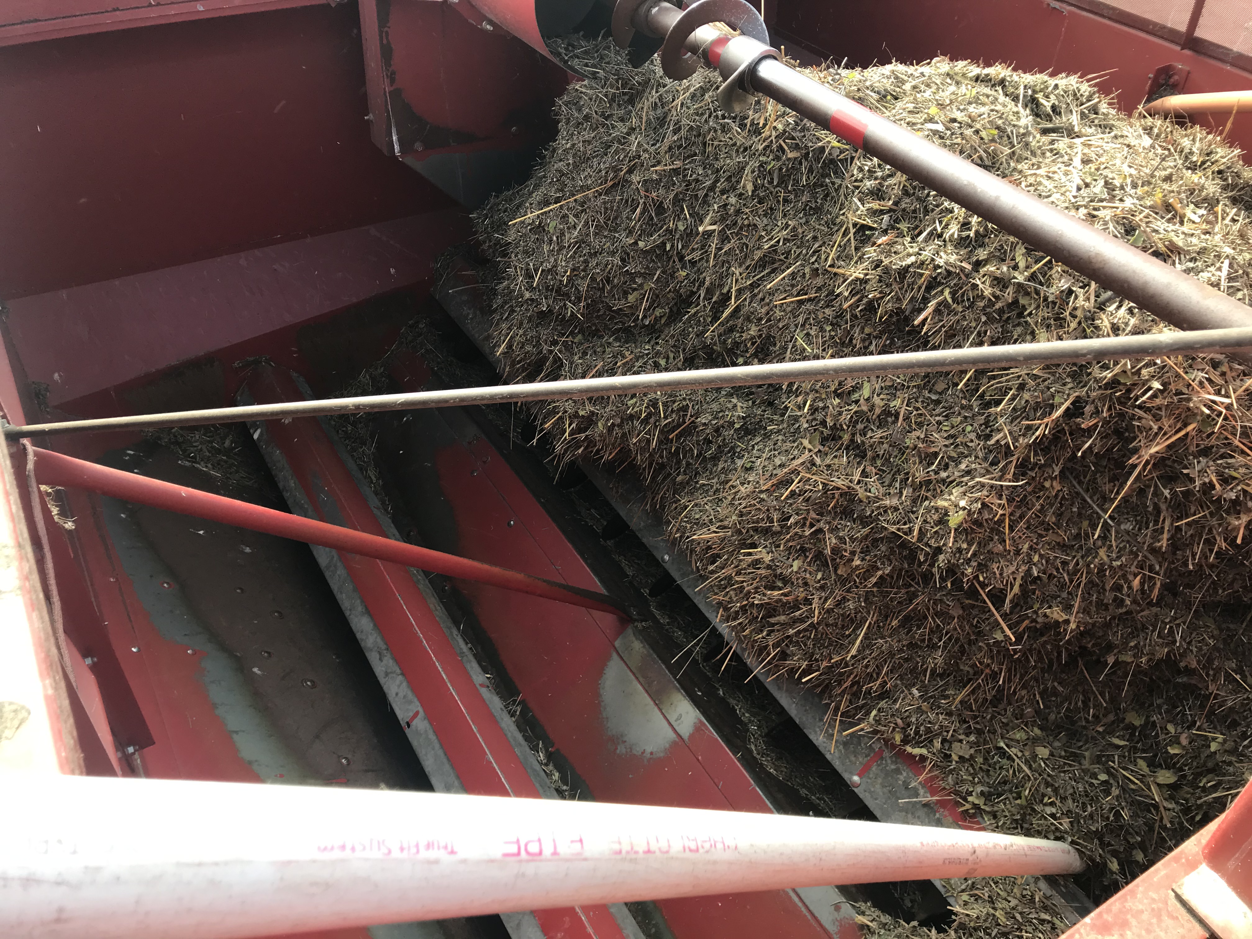 You are looking down at the grain tank of the combine. There are two augers at the bottom with metal covers hovering over and therefore hiding the augers. If you take the auger covers off the augers will bind from the prairie material, belts will smoke, wrenches will be weilded. If you leave the auger covers on the mix won’t go into those augers unless you continuously poke at the mix. This we do and use the ten foot long two inch white PVC pipe you see. It takes about 30 minutes to fill the tank, and about the same time to get it out of the tank into the grain wagon.