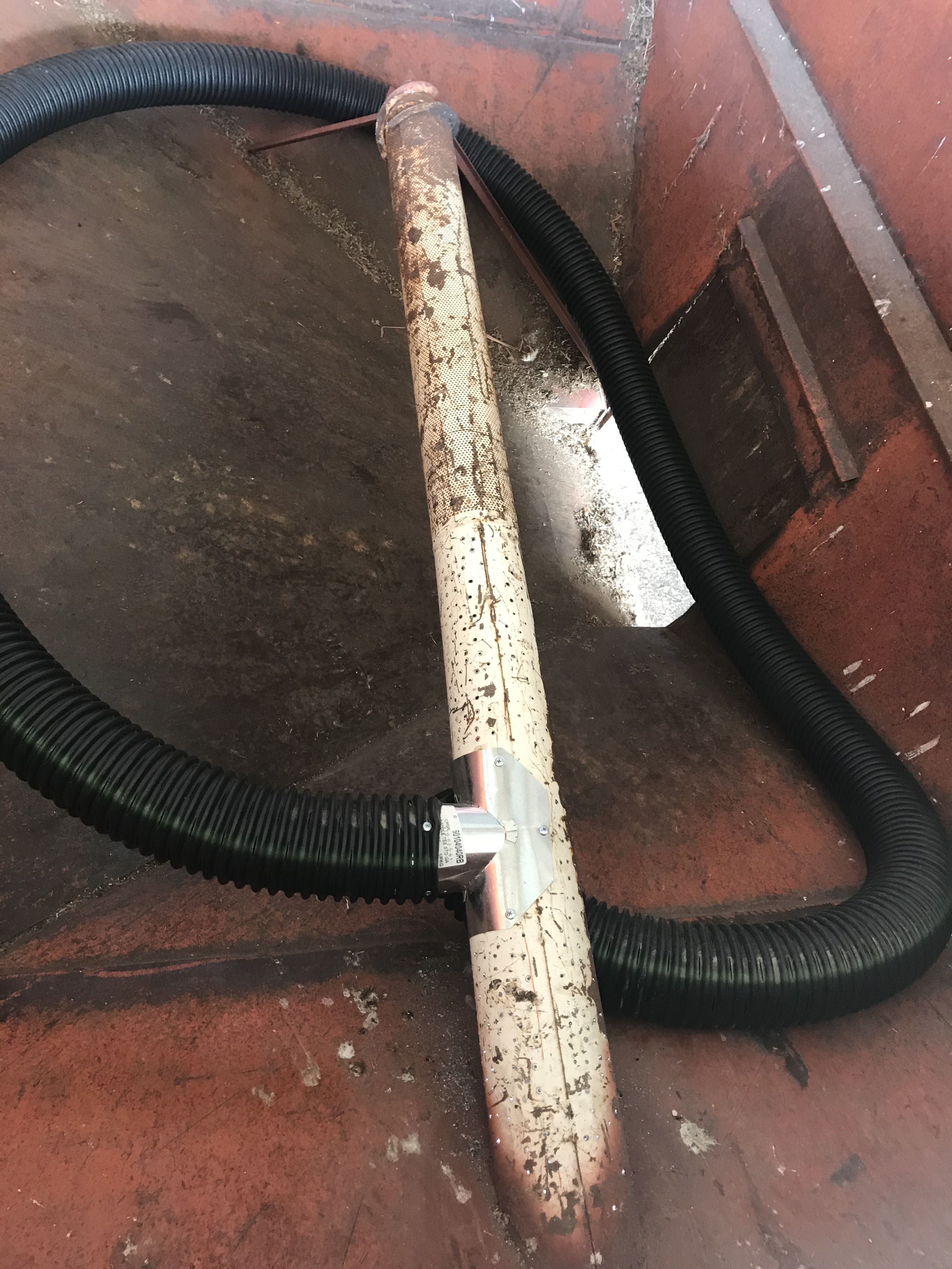 This is looking down in the grain wagon at the white perforated metal seed drier tube. I recently added the black 4 inch diameter perforated black tube because we had some very damp seed that was struggling to dry. This seems to work better.