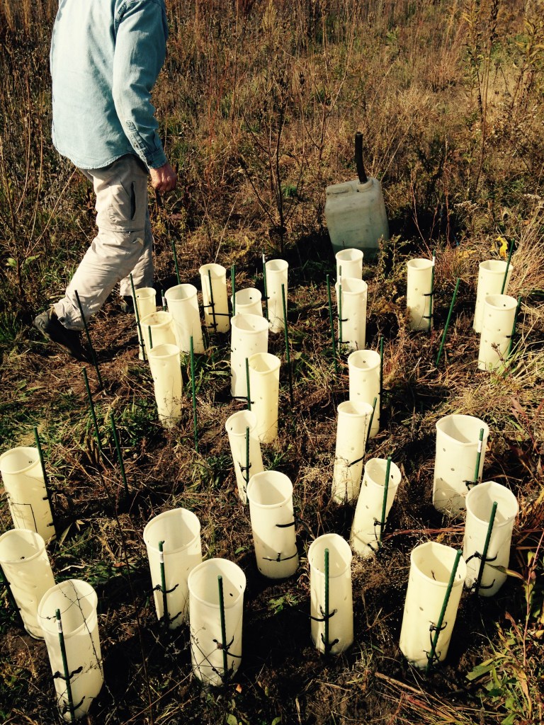 Photo #2: Larry Creekmur with planted plugs protected with plastic cylinders.