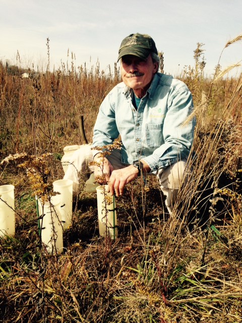 Photo #2: Larry Creekmur with planted plugs protected with plastic cylinders.