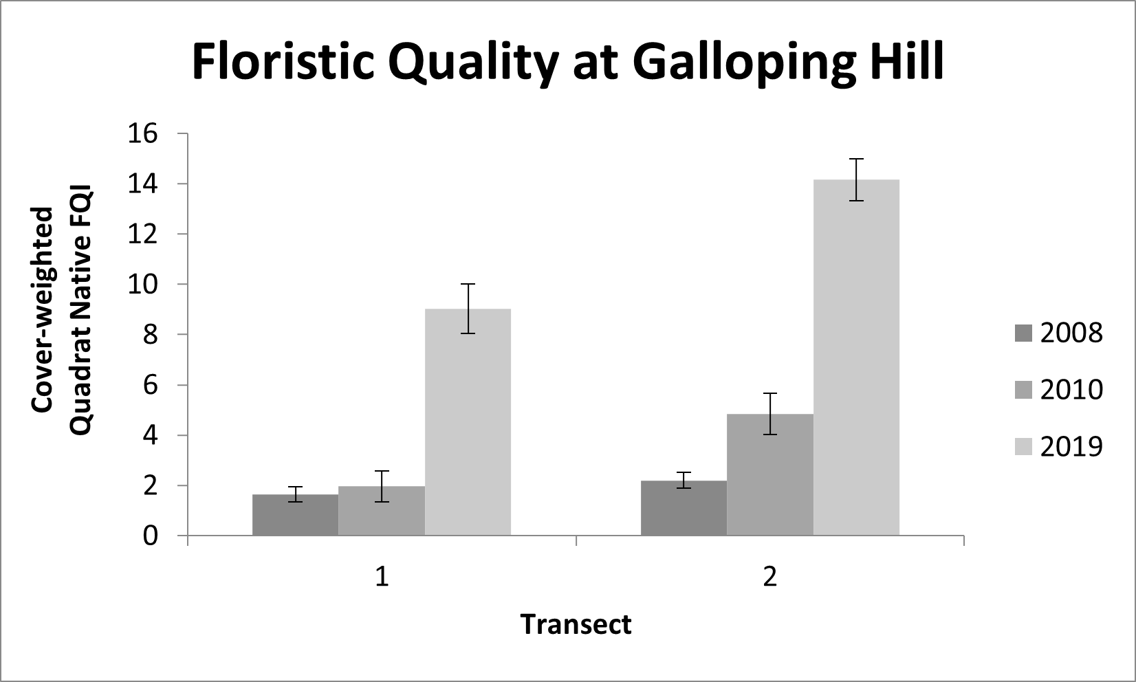 Vegetation transects were established early in the restoration and have shown steadily increasing floristic quality, approaching that of our region’s highest quality prairies after just fifteen years of management.