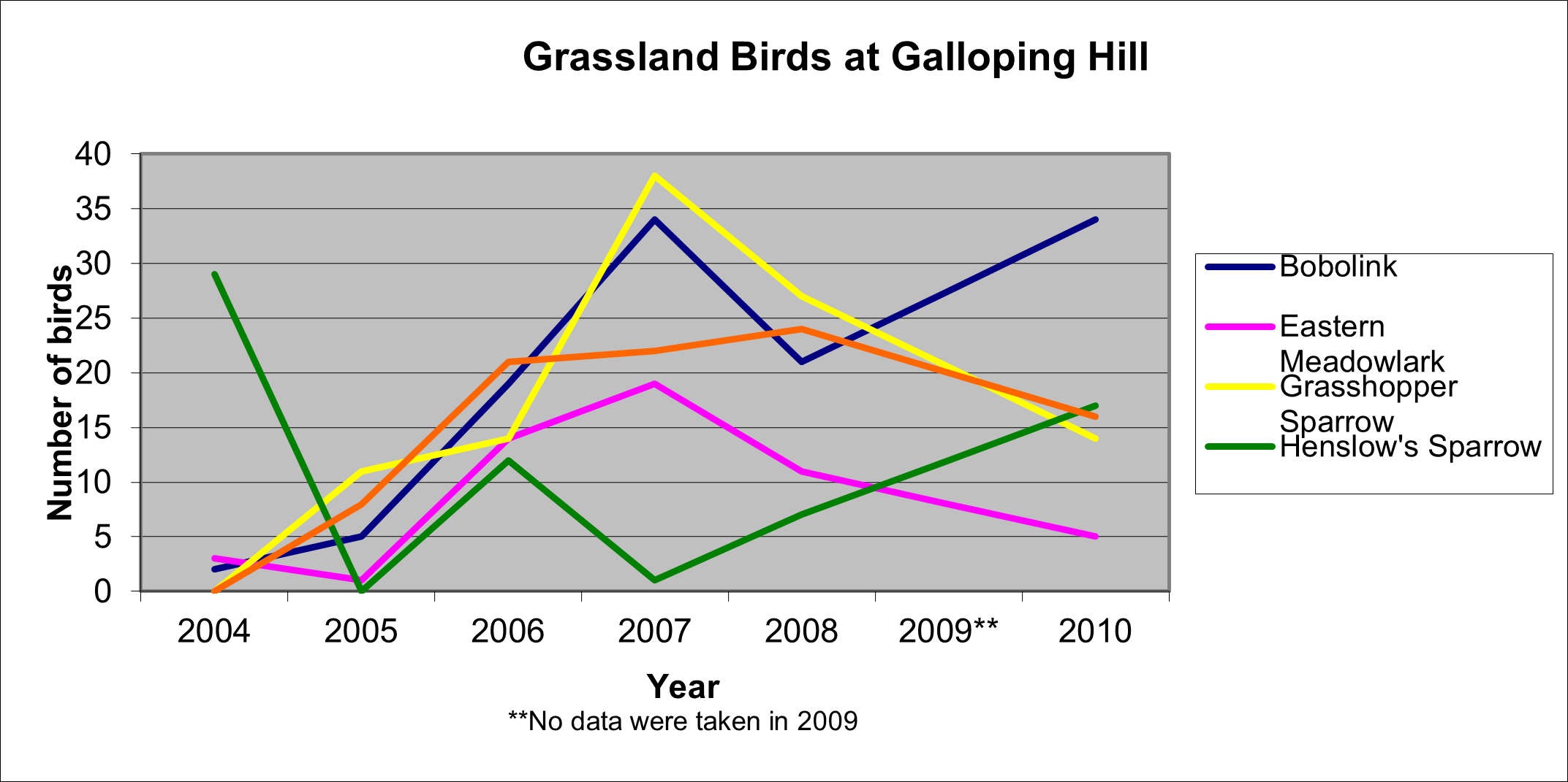 Eastern Meadowlarks, Savannah and Grasshopper Sparrows have declined from high counts in the first 5 years of the project. These three species have also shown significant population declines regionally, as recently reported by the Bird Conservation Network so it is unclear how much of this decline is a local versus regional issue.