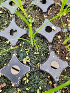 Wood Betony plants with sedge host on 5/09/2022, about a month after sowing the seed in the greenhouse.