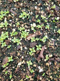 Wood Betony seedlings sown in a tray without a host. This is from the warm, cold, warm stratification method. The cold stratification batch had no germination. Photo taken 5/02/2022