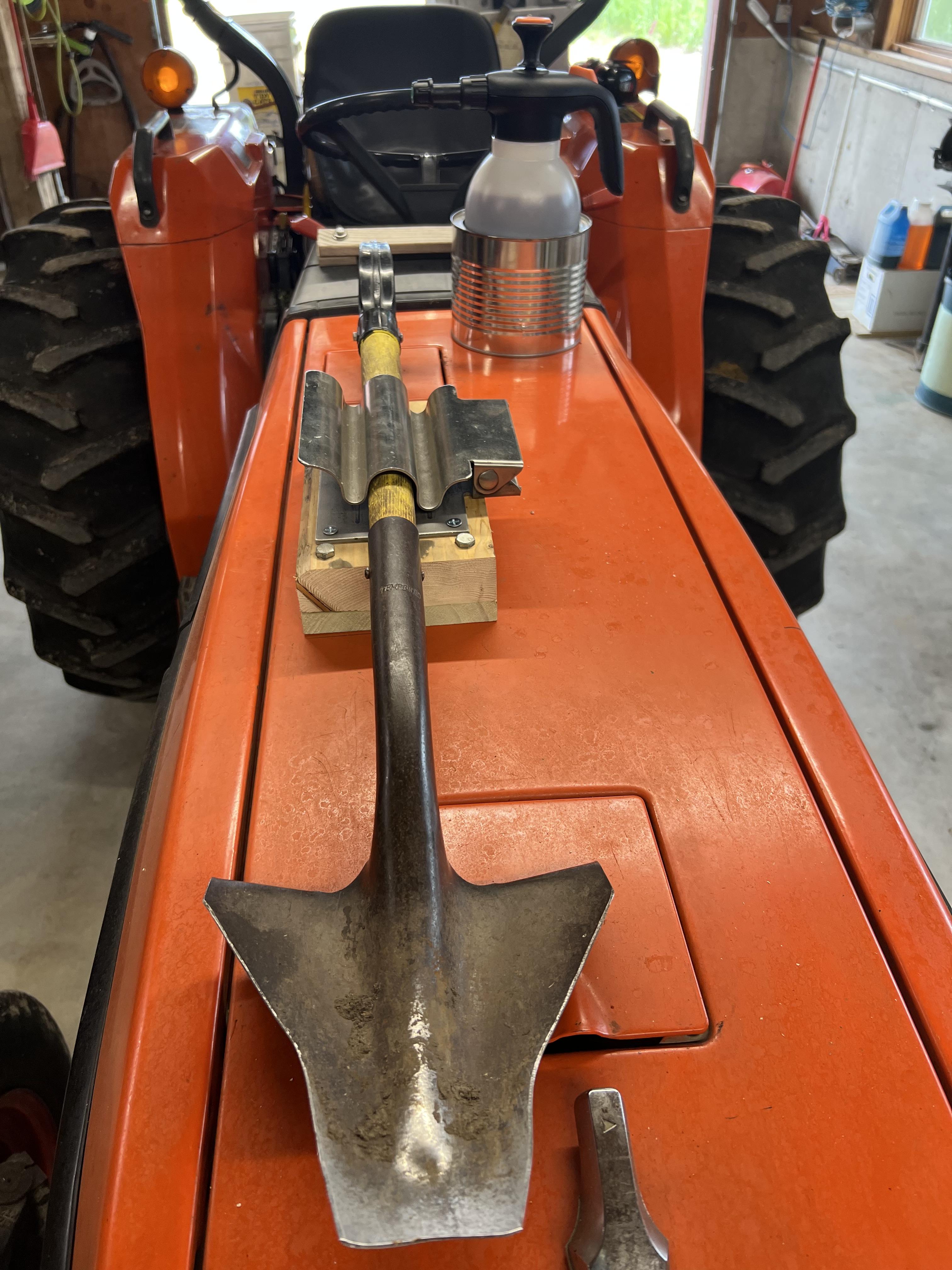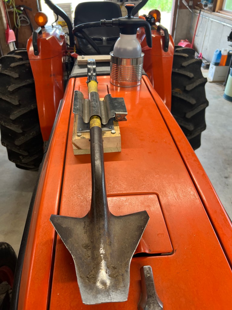 Recently I added a heavy duty tool clamp to hold our weed spade. This let’s me pull some sweet clovers rather than spray them. We also bolted down a coffee can which holds a quart sprayer of basal bark herbicide. This lets me treat the lone autumn olive I find. Basal bark application has a much smaller herbicide foot print than if I were to foliar spray a large invasive shrub.