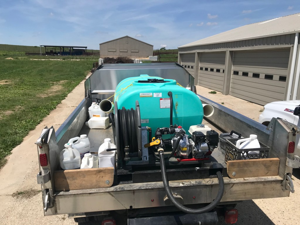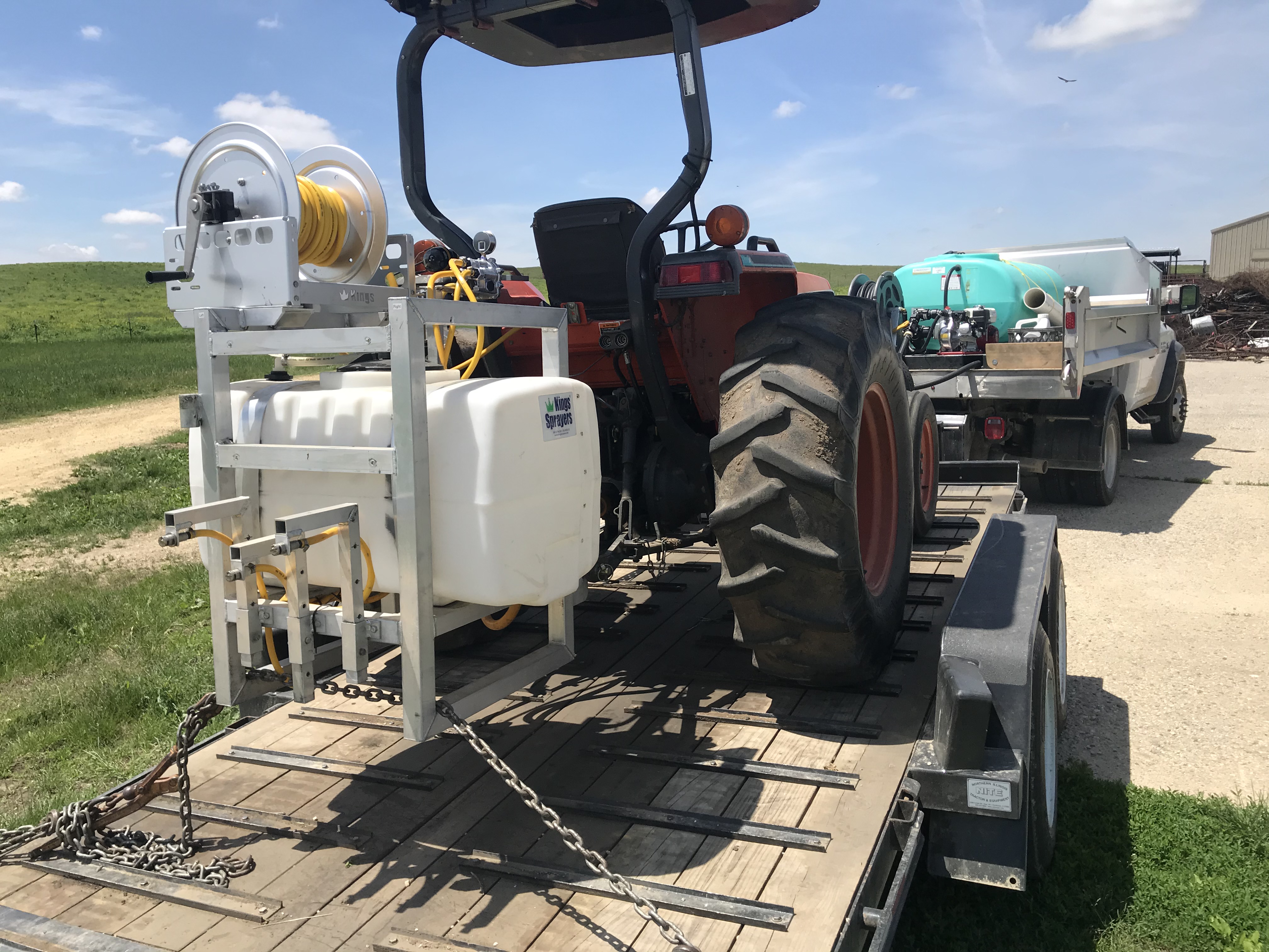 For years I have been using a small 30 hp tractor to cruise around grassland habitats looking for weed occurrences. The foot crews will be working with backpacks in certain areas and I will be off solo patrolling and controlling. With the ever increasing need for efficient stewardship I have ramped up this tractor setup. Now I tow the little tractor to a field entrance, unload, perhaps load up with just the right amount of herbicide using the tender truck’s tank of clean water, and some herbicide concentrates I keep in the bed. I don’t have to drive all the way back to headquarters to reload. I am self sufficient.