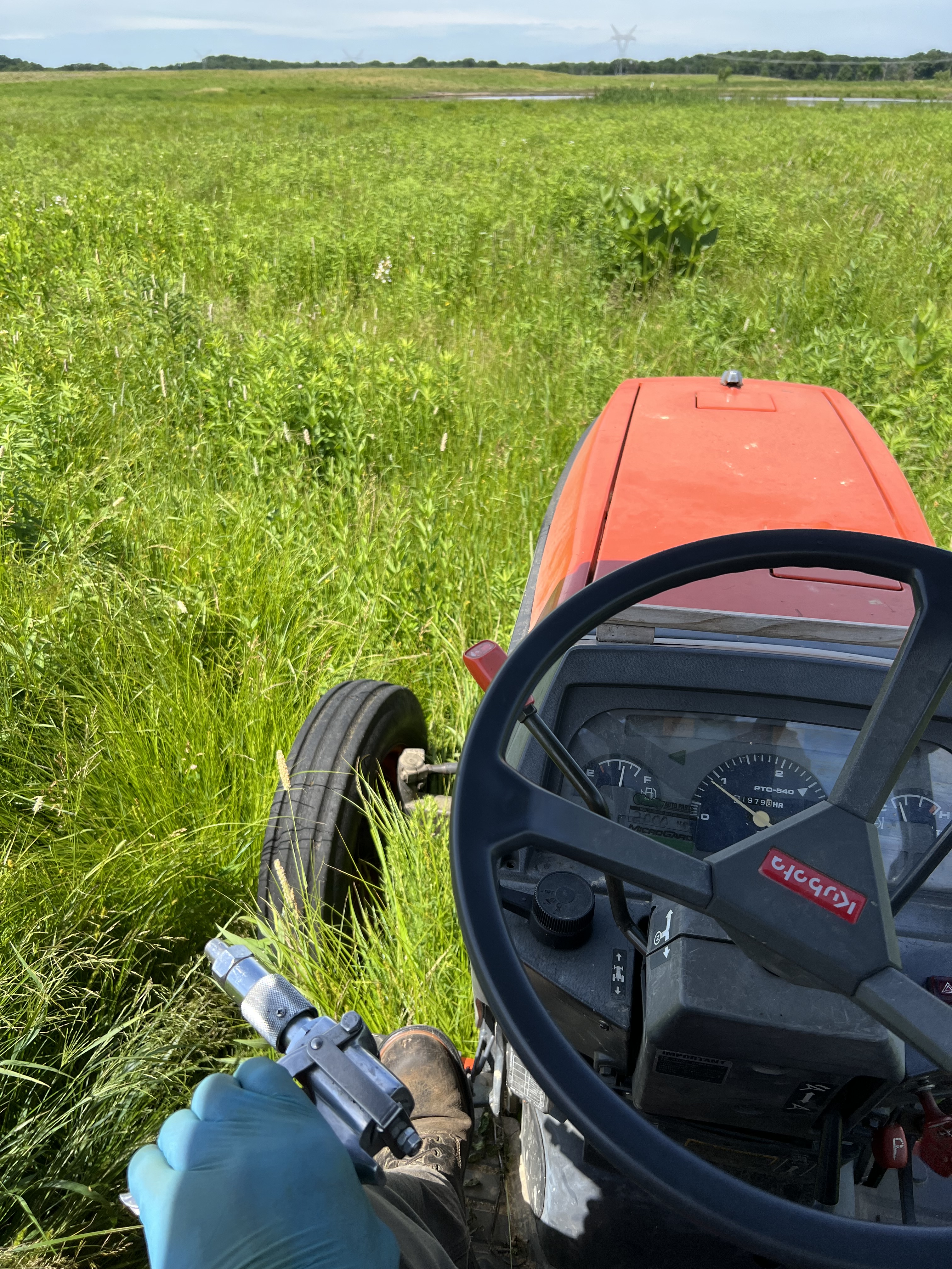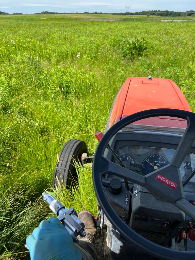 This is an old 30 hp Kubota two wheel drive which turns tighter than a UTV. It sits me higher up in the air to see the weeds below. I might not spray much herbicide with this hand nozzle but I can scout a lot of ground which saves our boots on the ground crew many steps. There is a “boomless” tip on the back of the tank which I don’t use much. Mostly, I am trying to see a lot of ground.