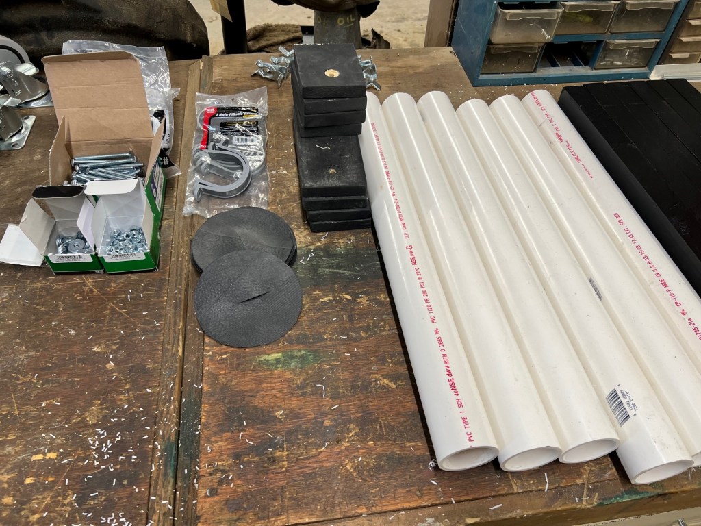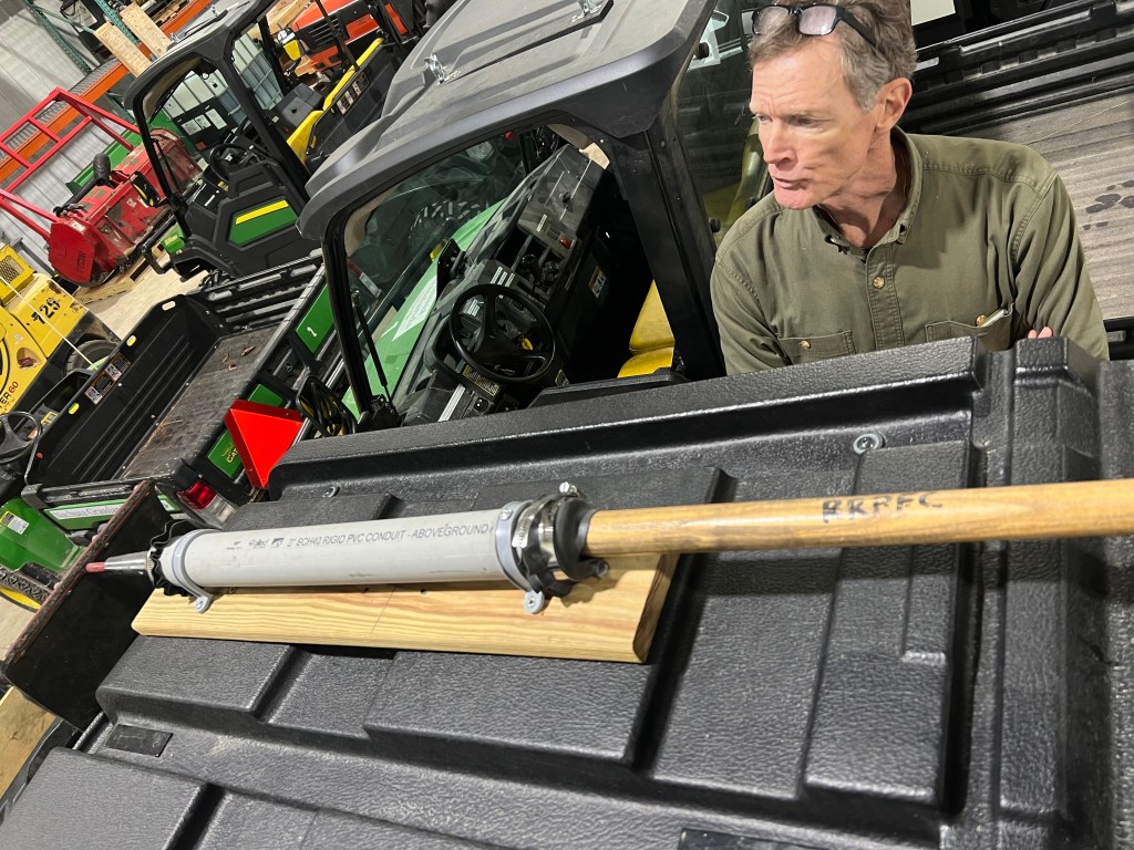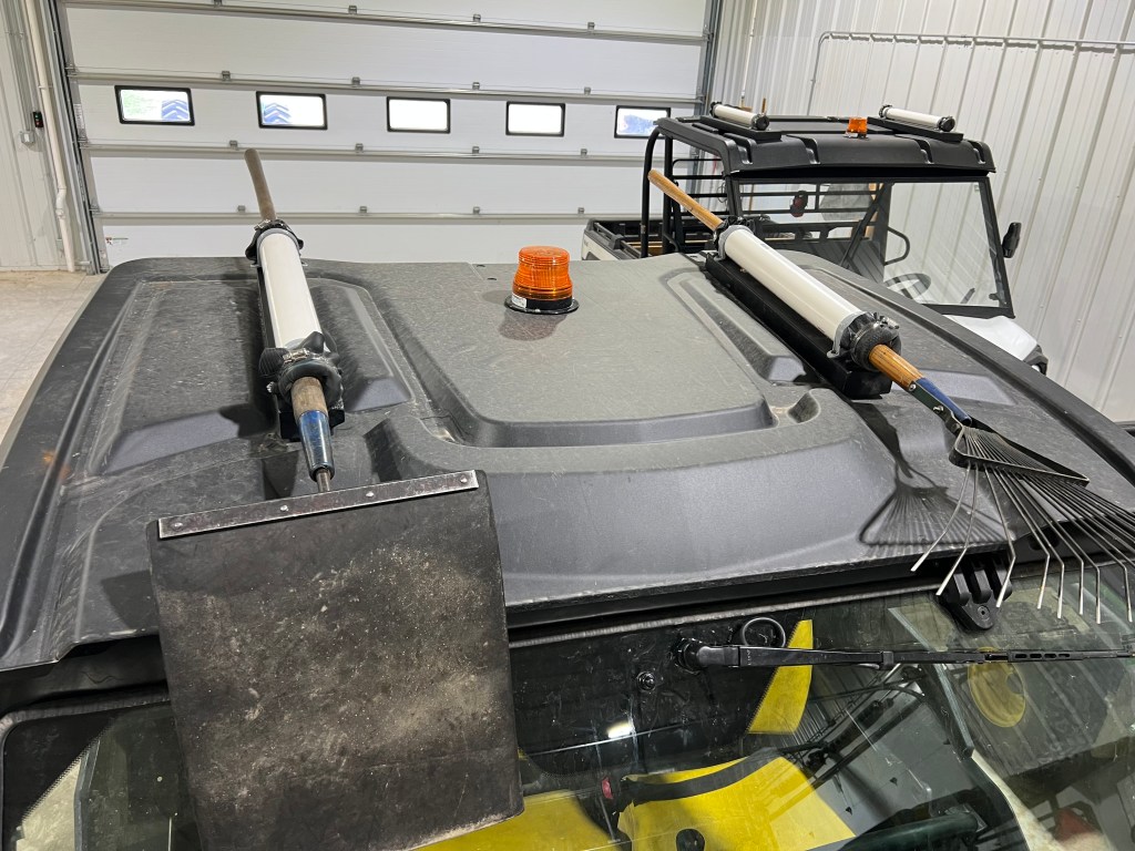 There is no great way to carry long hand tools on a UTV. Of late, volunteer Paul Mellen came up with this design and it works pretty good. This is 2″ white pvc pipe with the plastic clamps. (Maybe we should have tried 1.5 inch pvc. 1.25 inch is too small.) We bolted a board on the roof and the used screws as long as feasible, with washers on them, to affix the clamp to the wood.