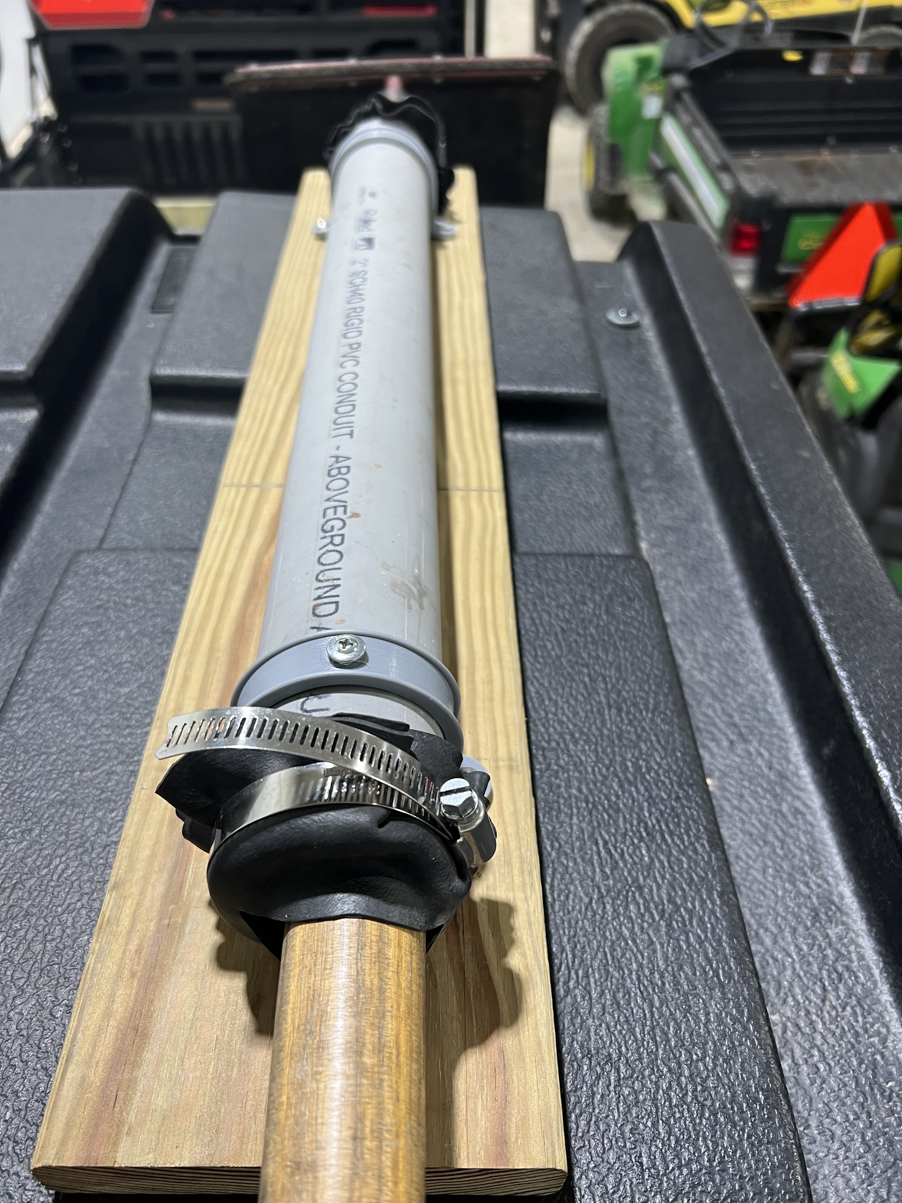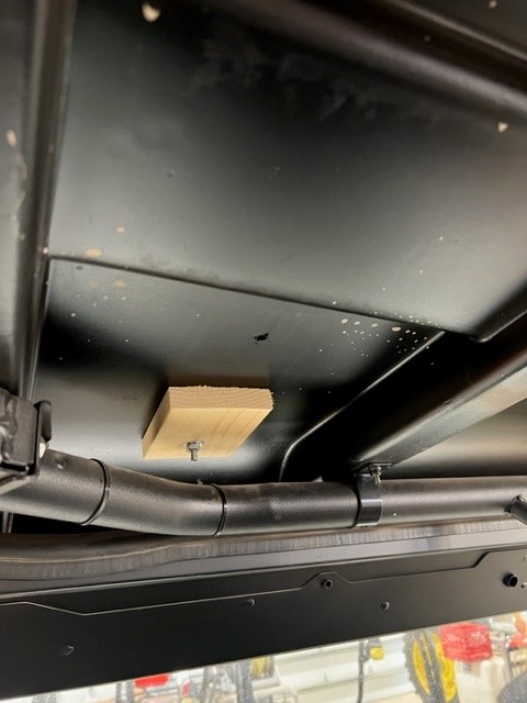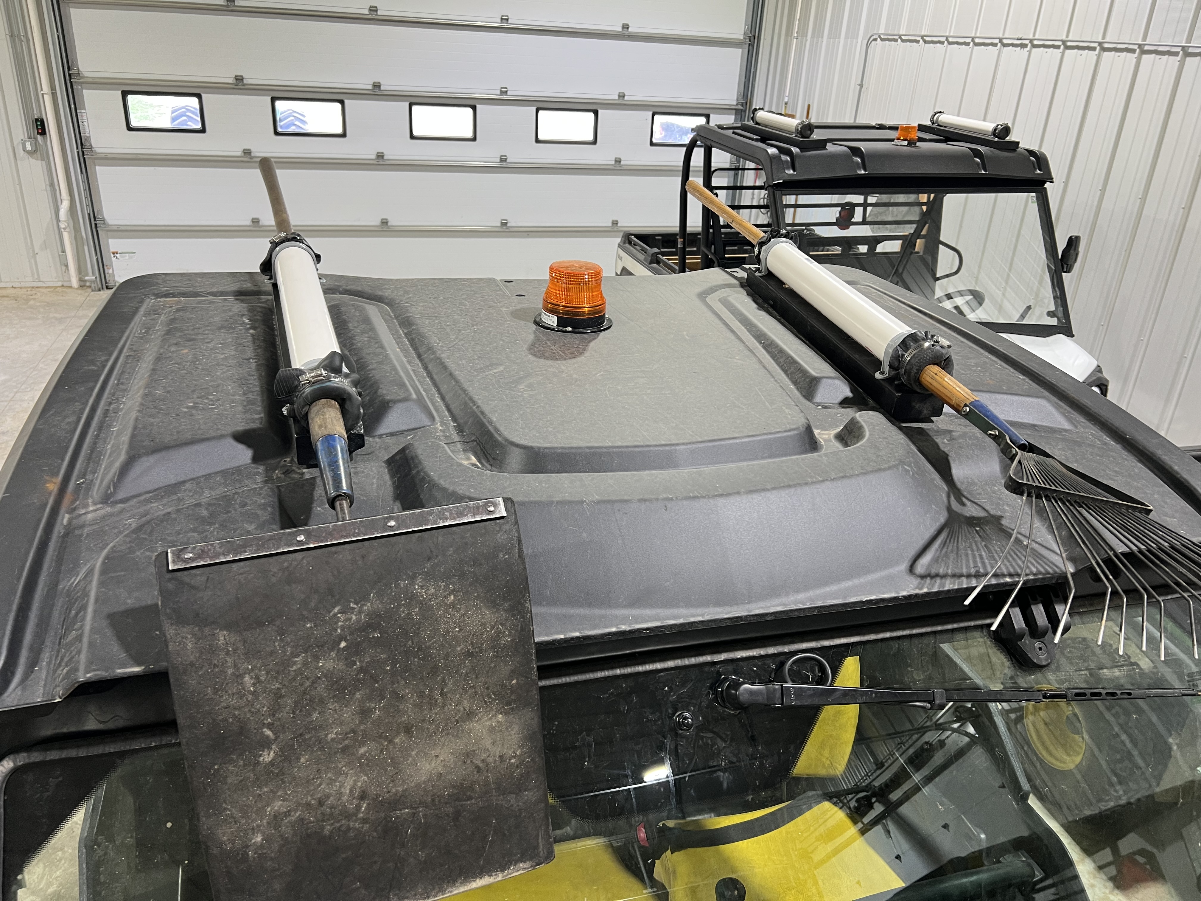 There is no great way to carry long hand tools on a UTV. Of late, volunteer Paul Mellen came up with this design and it works pretty good. This is 2″ white pvc pipe with the plastic clamps. (Maybe we should have tried 1.5 inch pvc. 1.25 inch is too small.) We bolted a board on the roof and the used screws as long as feasible, with washers on them, to affix the clamp to the wood.