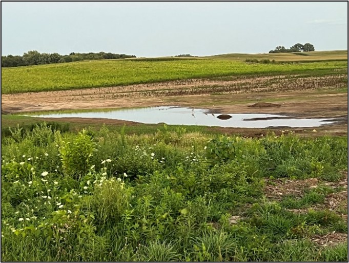 In the summer of 2023 leading up to the planting, an independent contractor was hired to prepare the site by constructing a series of dikes and scrapes which would hold water and encourage wetland conditions. We first decided that the area could host wetland habitat using the US Department of Agriculture’s web soil survey. This is a free online tool produced by the Natural Resources Conservation Service that reports the soil types and conditions within a desired area of interest. When we performed this soil survey for the planting site, we found that over half of the unit was made up of La Hogue loam soil, which is characterized by poor drainage. This information indicated where it would be most appropriate to construct the wetland scrapes. After that, we could get to removing the drainage tiles and finally start constructing the dikes and scrapes. By the first large rain after construction was complete, the site hosted two small ephemeral ponds which were already being visited by Killdeer, Pectoral Sandpipers, and Sandhill cranes! In only a summer a wetland had been created before our eyes.