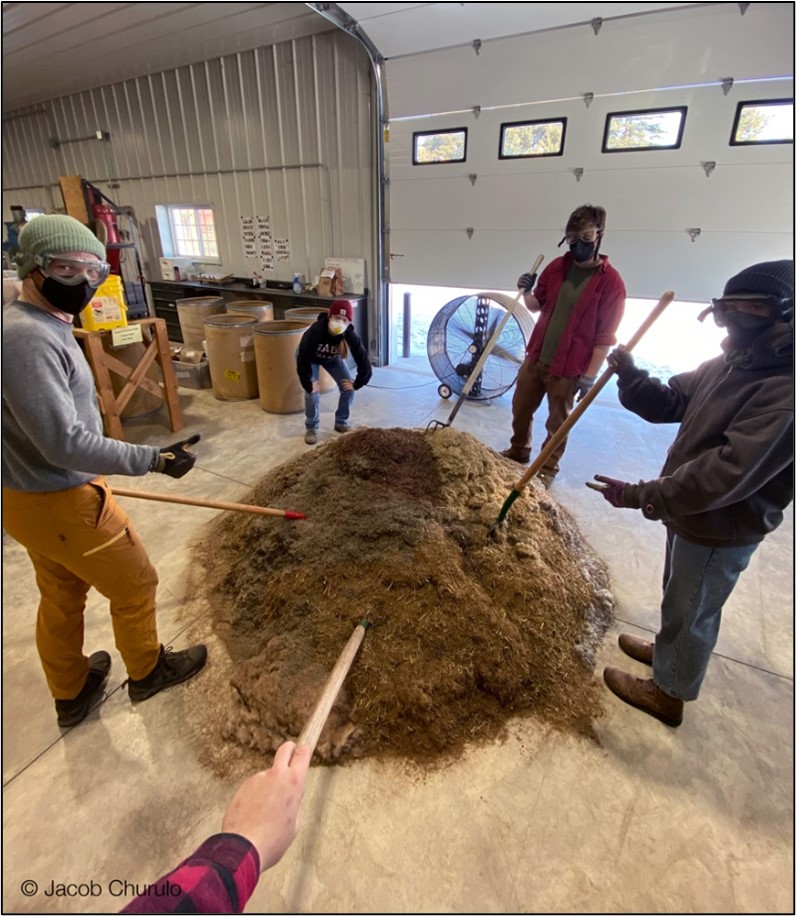 The seed mixes were prepared over the course of two days, and the planting was finished in three days. Dressed in a dust mask and goggles with pitchfork in hand, we got to work mixing 100s of Lbs. of seed at a time to create five mixes: dry, dry mesic, mesic, wet, and wet emergent. We also utilized a 2020 mix specifically made for dikes, which was a collection of different combine mixes of mostly mesic-dry mesic seed that would support the dike soil from erosion.