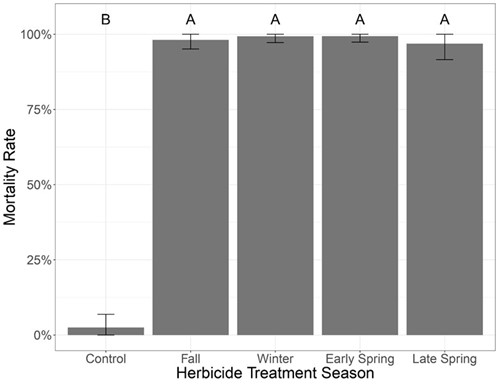 All basal bark applications were equally effective at killing Amur honeysuckle (statistically indifferent), regardless of treatment timing. There was an insignificant variation in how effective the treatments were with the late spring treatment only being 96.7% effective. The combined mortality rate of herbicide treatments was 98.4% across all four herbicide treatment seasons, compared to a 2.5% mortality with no basal bark treatment. Mortality was not dependent upon honeysuckle size (height: <1m to 3+m tall, number of stems: 1-12+ stems, or root collar size: 10-150+mm). Prescribed fire did not impact mortality positively or negatively.