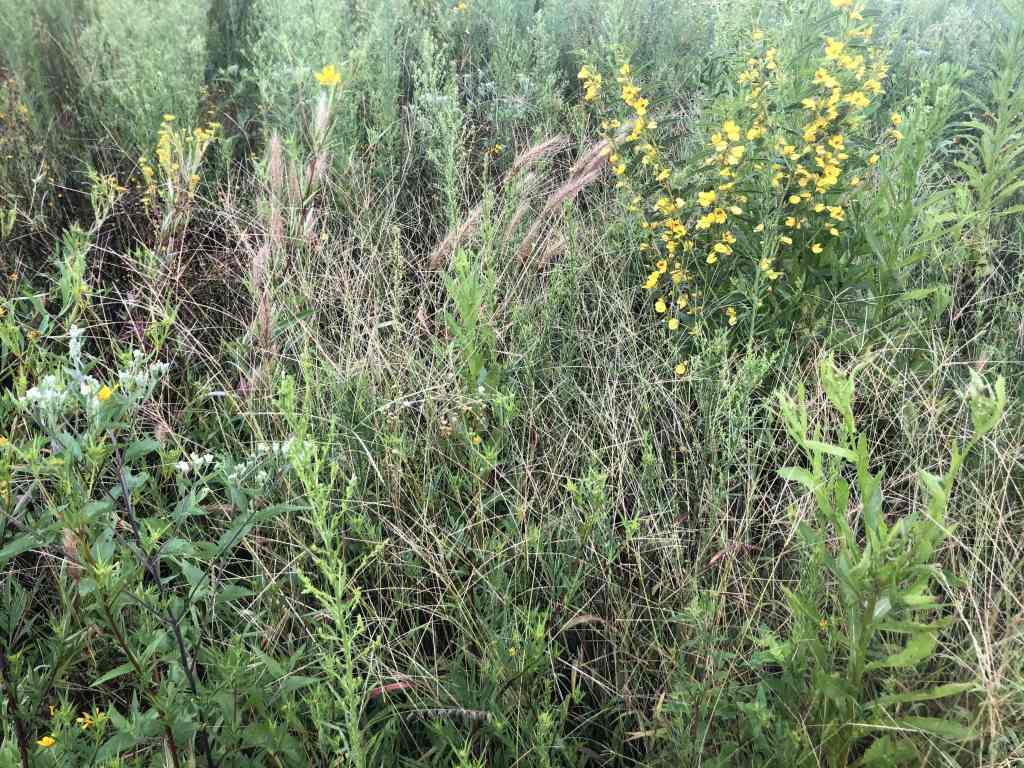 I walked the ground in the early summer hoping to spot seedlings. I didn’t like how much non-native brome I saw and I was impressed with the abundance of plain’s coreopsis (Coreopsis tinctoria) growing across the site (it was seeded but also was in the seed bank). I found many, many native plants but lots of the usual suspects too: fireweed (Erechtites hieraciifolius), mare’s tail (Erigeron canadensis), ragweed (Ambrosia artemisiifolia) and fox tail (Setaria pumila). We mostly do not worry about these distrubance driven annual Ag weeds.