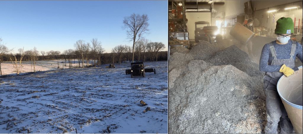 Left – frozen snowy ground for seed sowing of 40 acres on January 16th. Right – Restoration team mixing 1,000 pounds of hand collected, bulk milled seed.
