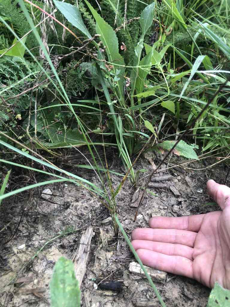 A few patches of what I think is Bromus japonicus (Japenese brome). This area had been old-field succesional closed-canopy cedars and mesophytic hardwoods for decades…so it took us by surprise. There are native seedlings in and around the Brome, but not as many as we’d like.