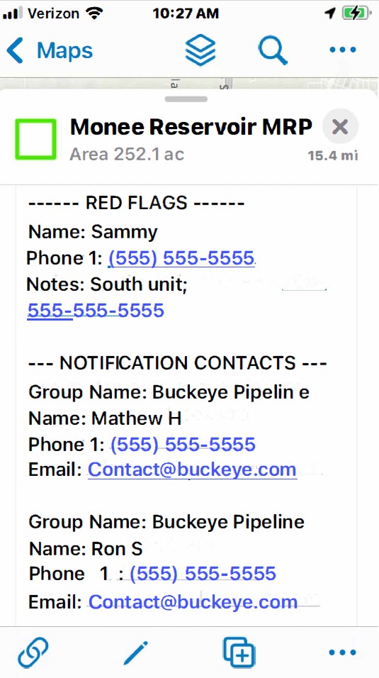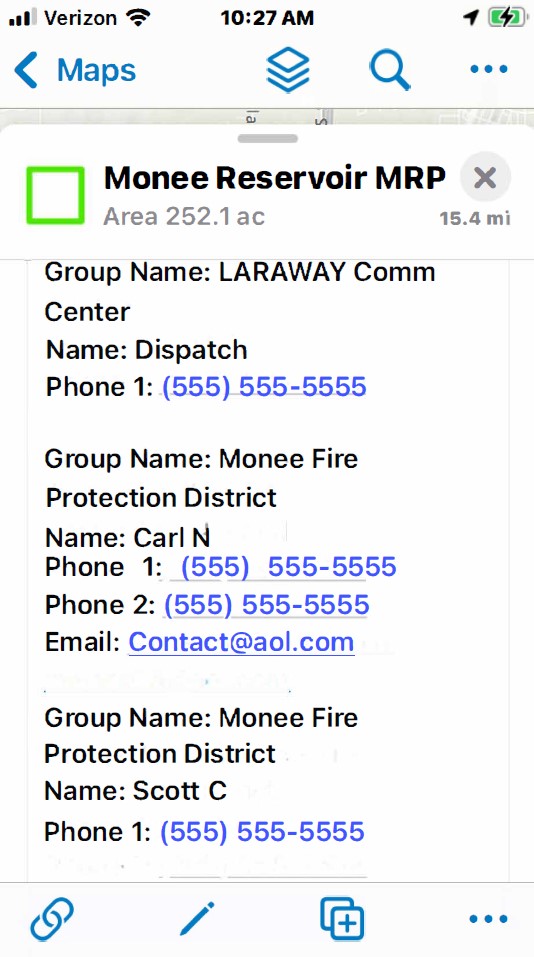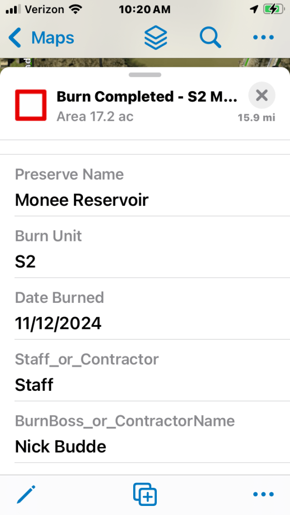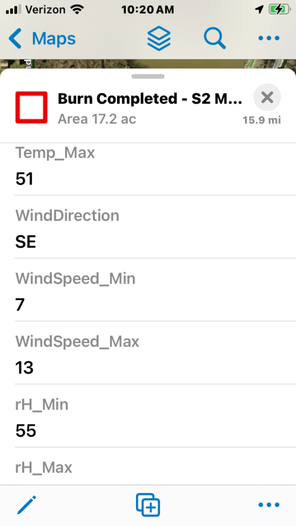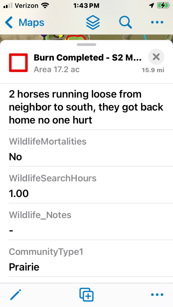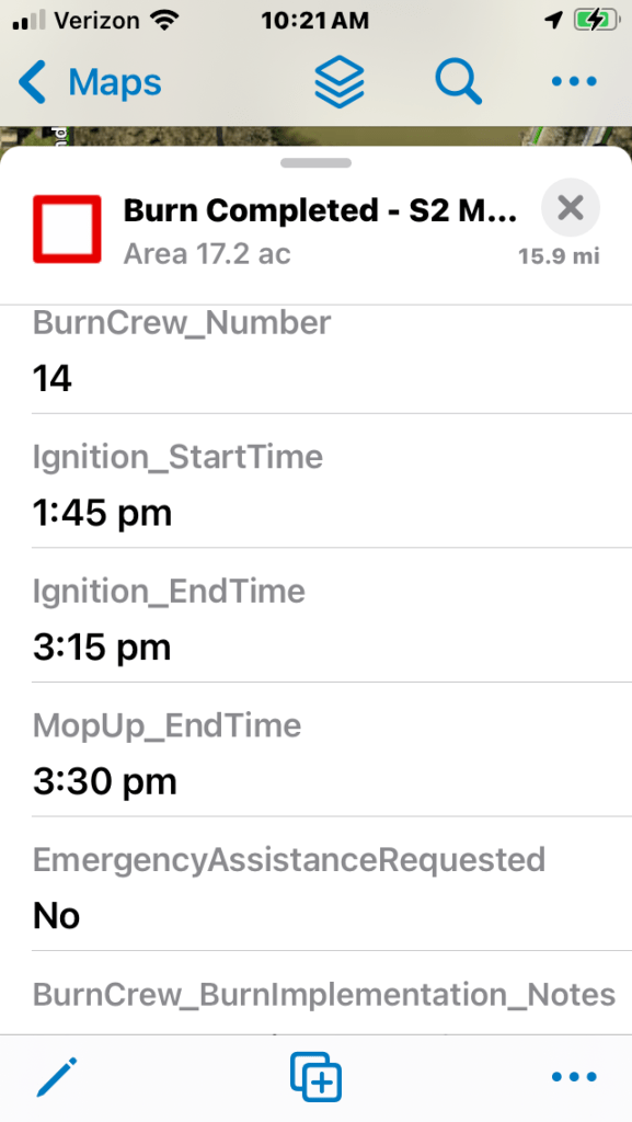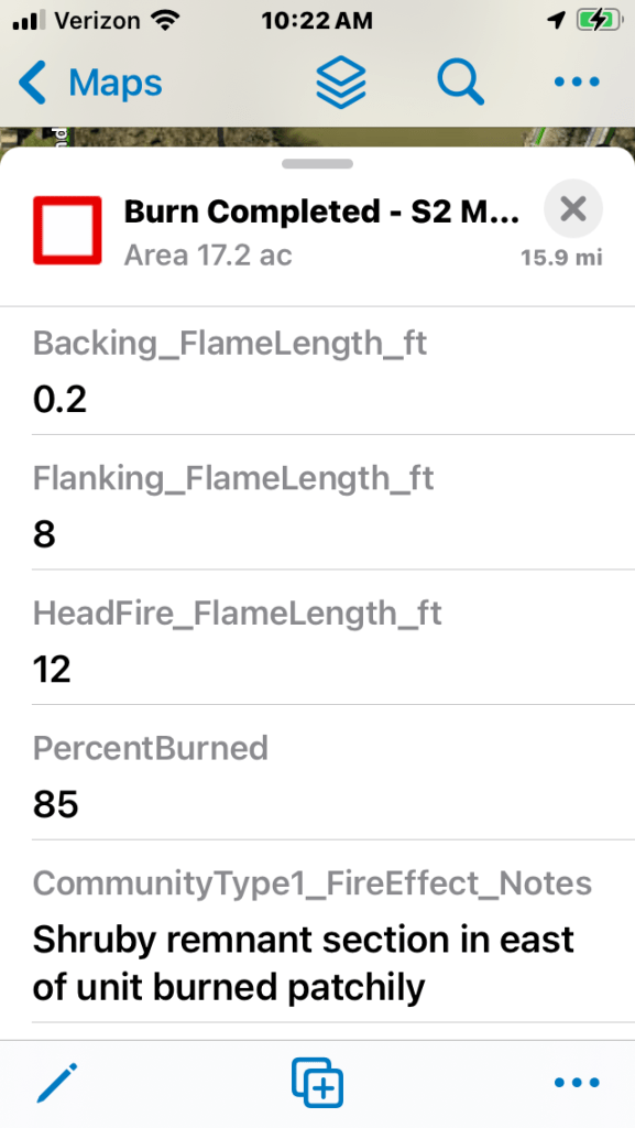 In addition to using Field Maps for burn data collection, we have the following reference information loaded into our burn maps: burn notifications (contact names, agencies, phone numbers), fire districts, fire station locations, utility poles, pipeline locations, hazard locations, deer stand locations, fire break locations and status, way point locations, brush pile locations, prior burn history, preserve boundaries, trails, and waterway locations. So much great information!! My personal favorite is that I can tap on a dispatch phone number at the end of a long burn day when my eyes are full of smoke and not working well, and it automatically calls the number without me having to (mis)dial it! Yes, we are absolutely loving using Field Maps for prescribed burns.