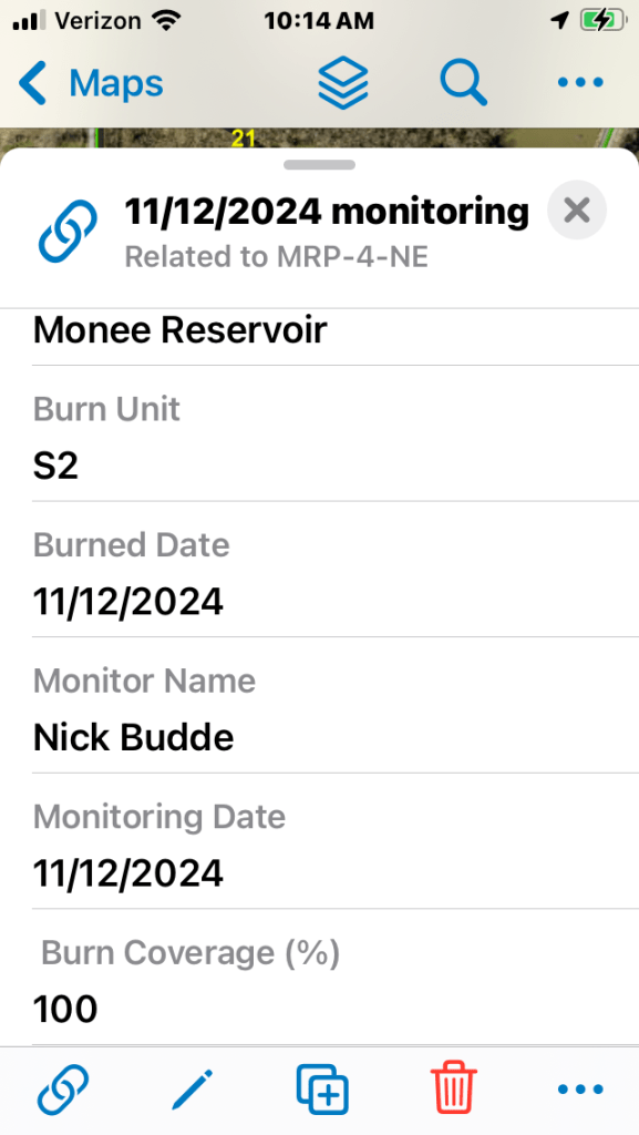 We also use Field Maps to document our prescribed burns completed. We can either copy the shape of an existing burn unit, or drawn in a new polygon to depict the area burned, and then enter information about the burn using the app. Our burn report includes basic data about the burn (e.g., unit name, date burned, burn boss name), weather data (e.g., temp, wind speed and direction, relative humidity, days since last precip), burn implementation data (crew size, start and end times, notes), wildlife mortalities and search effort, and fire effects (community type, flame lengths, percent burned, notes).