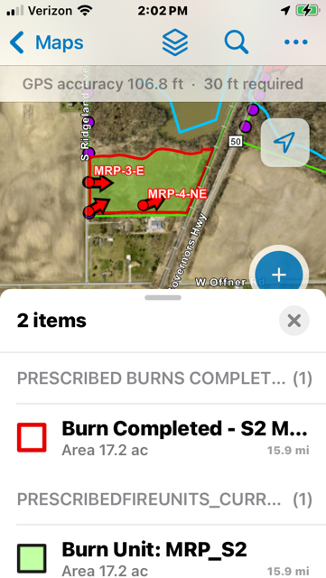In addition to using Field Maps for burn data collection, we have the following reference information loaded into our burn maps: burn notifications (contact names, agencies, phone numbers), fire districts, fire station locations, utility poles, pipeline locations, hazard locations, deer stand locations, fire break locations and status, way point locations, brush pile locations, prior burn history, preserve boundaries, trails, and waterway locations. So much great information!! My personal favorite is that I can tap on a dispatch phone number at the end of a long burn day when my eyes are full of smoke and not working well, and it automatically calls the number without me having to (mis)dial it! Yes, we are absolutely loving using Field Maps for prescribed burns.