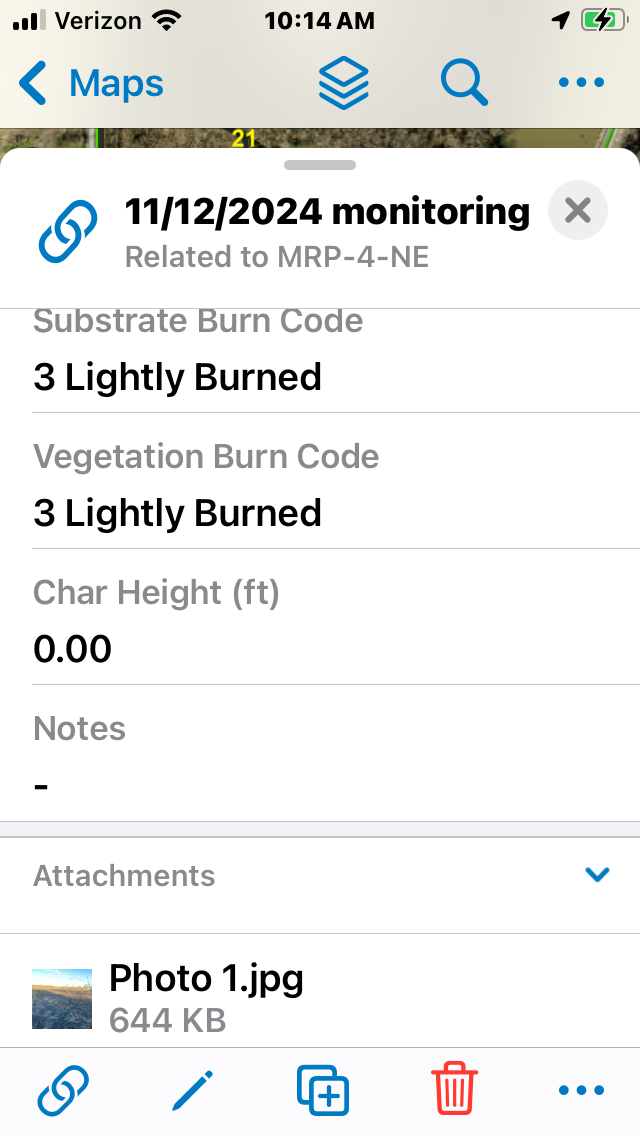 When we add burn monitoring data, we use pre-established drop downs to select the appropriate fire severity category and enter values for burn coverage and char height. Then, we take a photo through the app which links to that monitoring event and photo point location. It’s very user-friendly and fast!