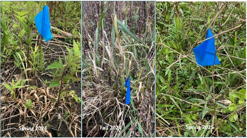 Fall treatments of clethodim, a grass-specific herbicide, are fairly consistently effective on reed canary grass – see previous study here and follow-up observations here. However, it’s desirable to treat invasives before they go to seed, and as natural area managers, we generally want to kill reed canary grass in the spring before it goes to seed. Spring clethodim treatments to reed canary grass have seemed to be more variable in results. To try to figure out why some treatments are more effective than others, I marked individual reed canary grass plants from ten different clethodim treatments between April and July, 2024, and tracked their outcomes the following spring (2025).